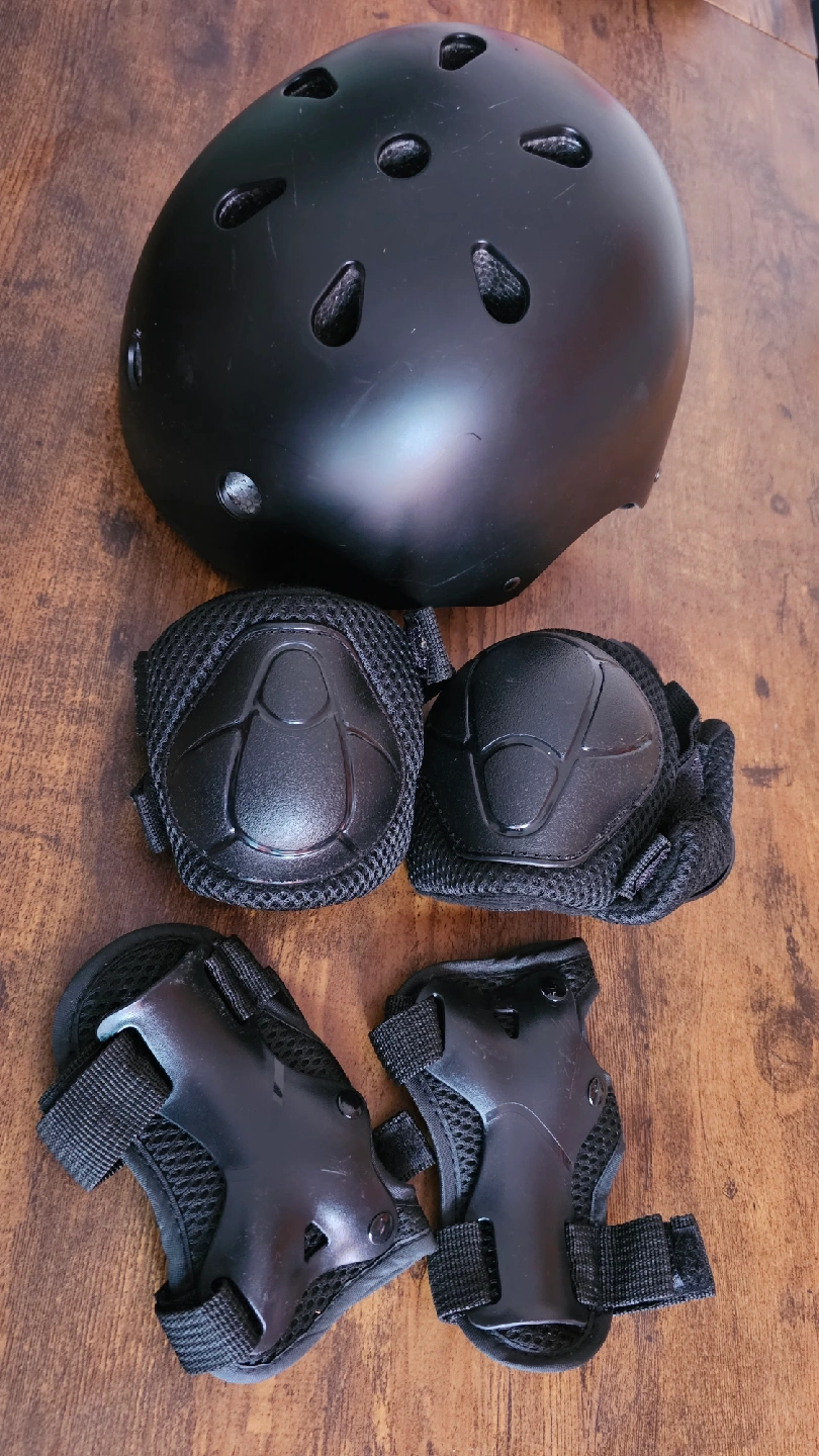 81Black helmet with matching protective gear for young kids around 2-4 years old. This set includes a helmet, elbow pads, and wrist guards. Perfect for skating, biking, or any activity where you need a little extra protection! Pick up soon if interested.