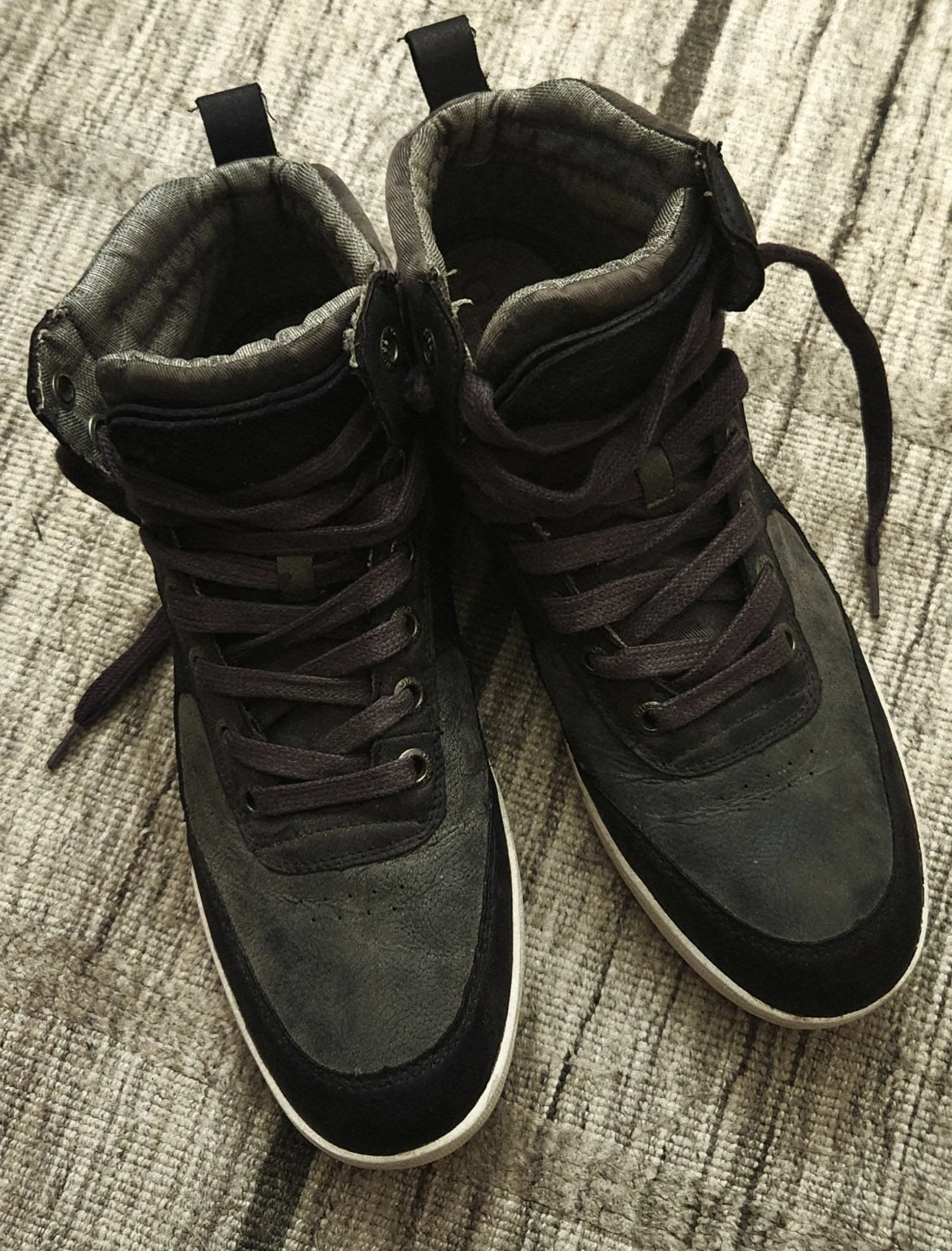 65Selling a pair of black high-top sneakers. They're in good condition and ready for a new home!
