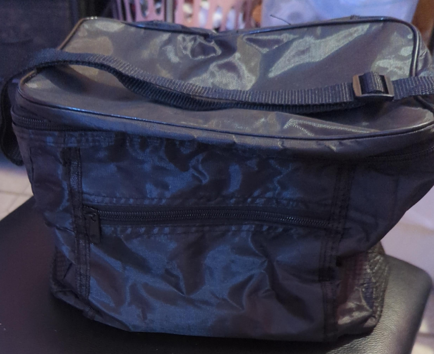 I'm selling a black insulated lunch box! It's perfect for keeping your food cold or warm on the go. It has a zipper closure and a shoulder strap for easy carrying. It's in good condition and ready for a new home🧡