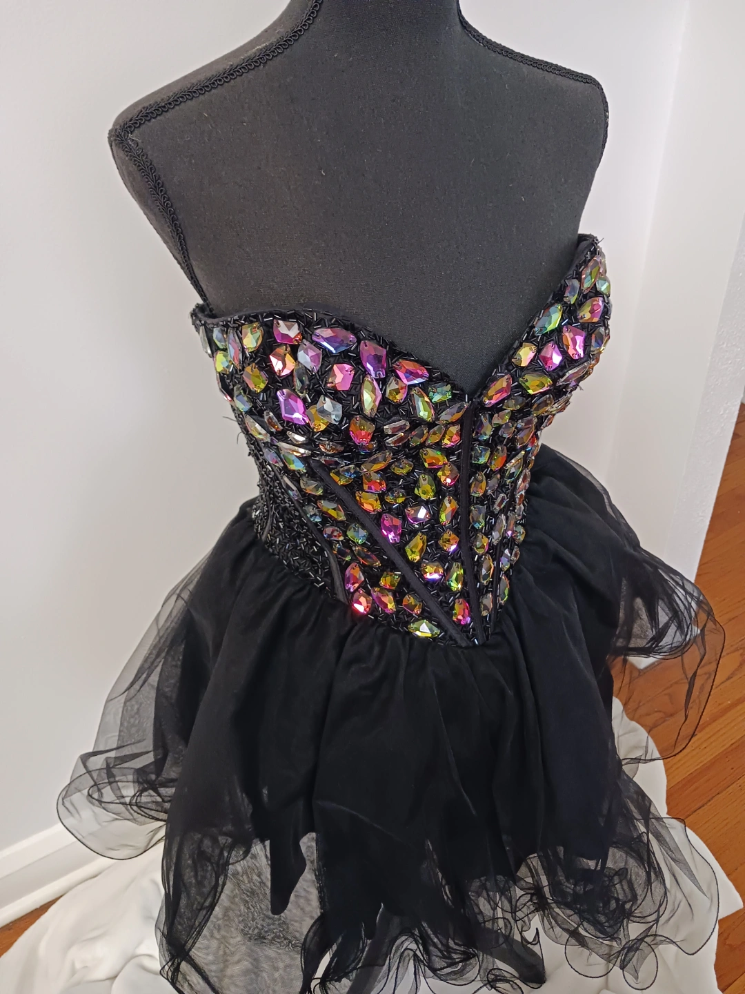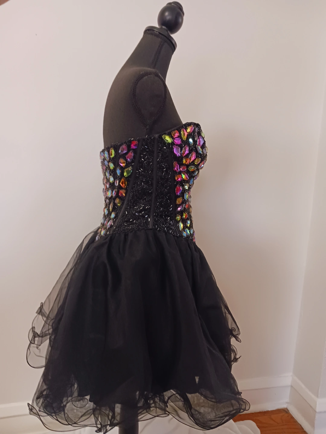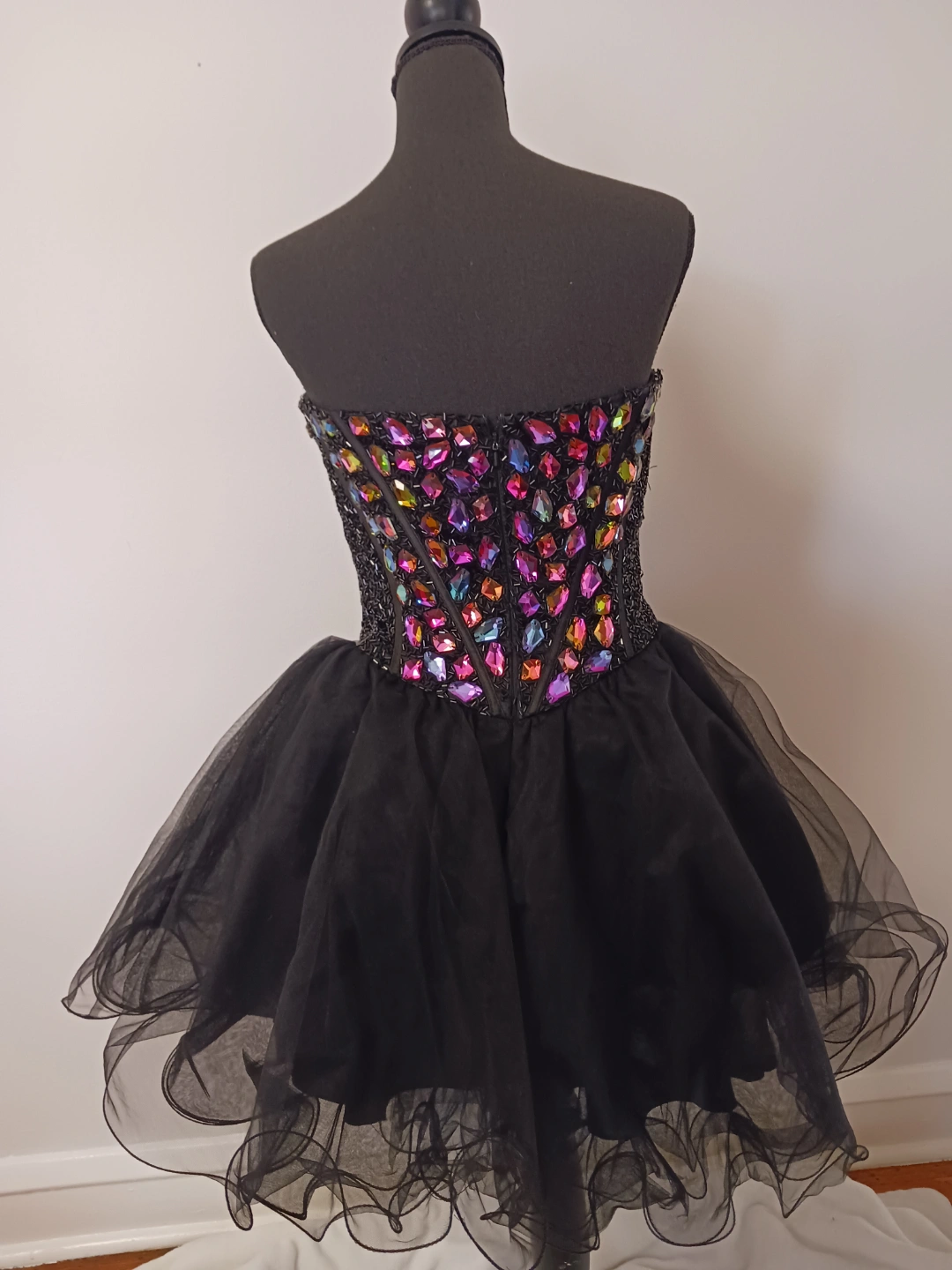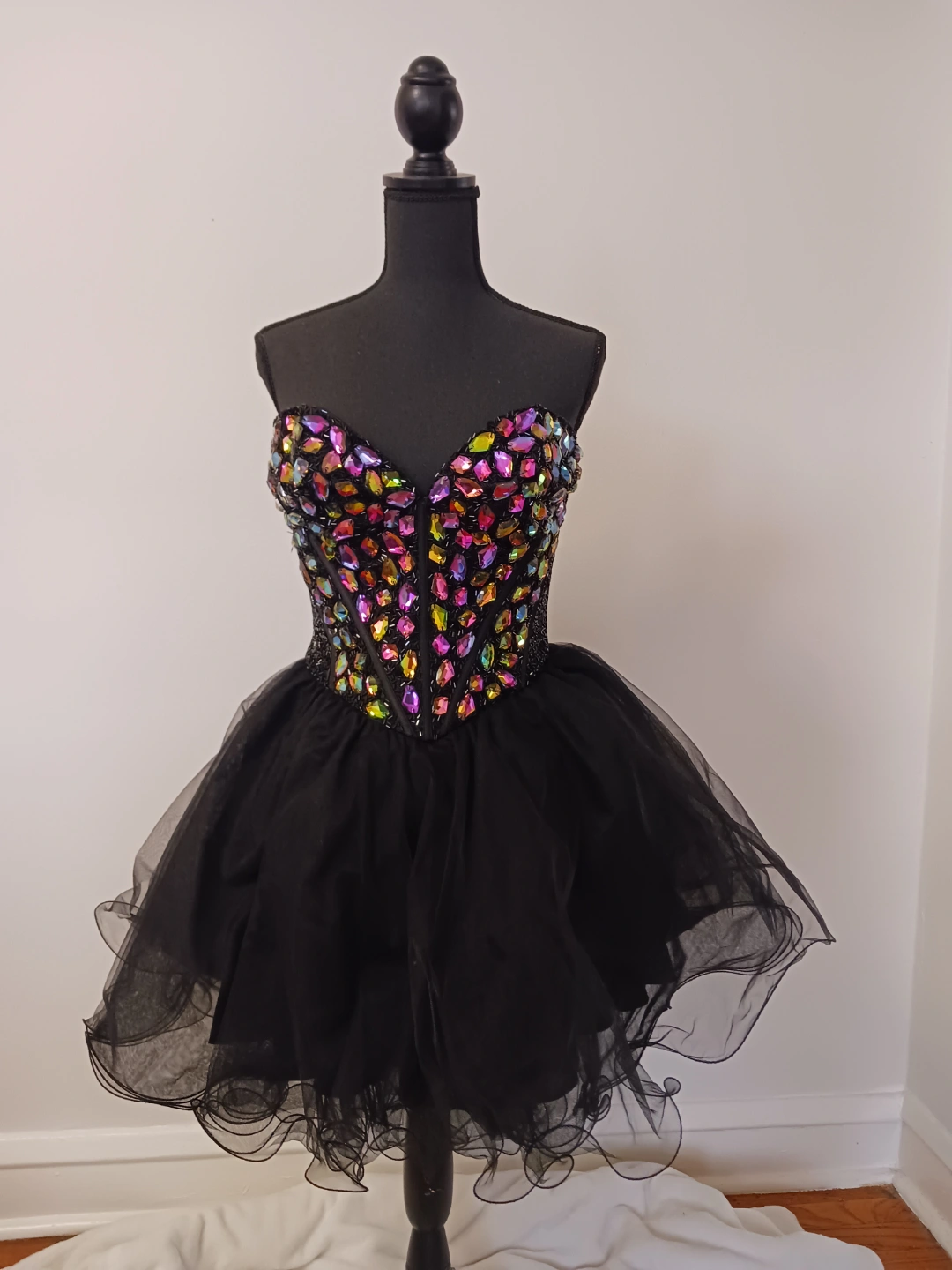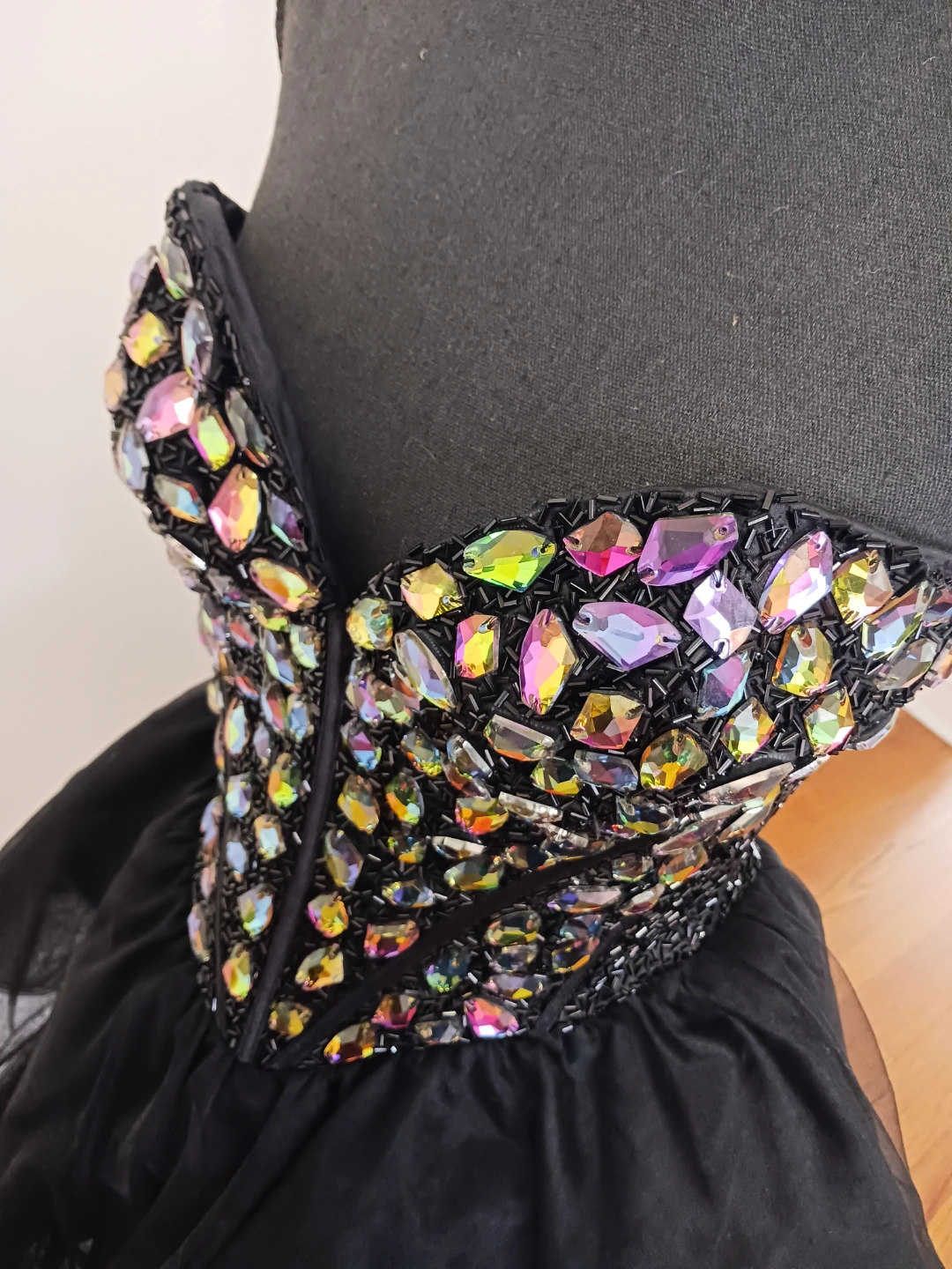 Stunning black jeweled dress. Sweetheart neckline, corset bodice. Multicolored jewels. Tulle skirt. Short dress.
