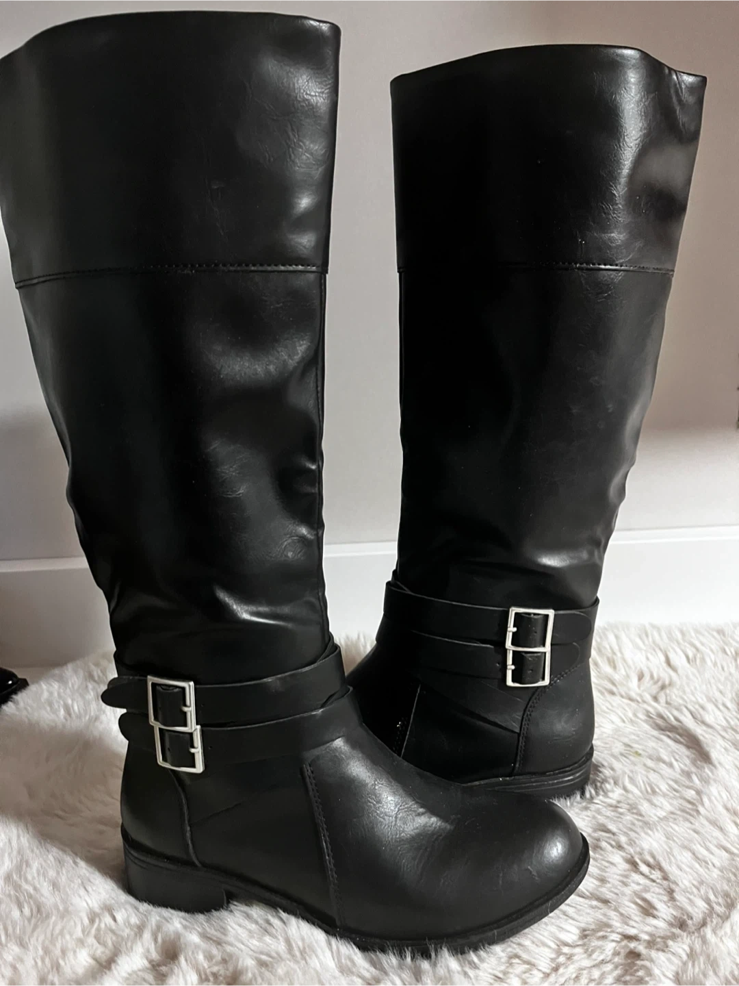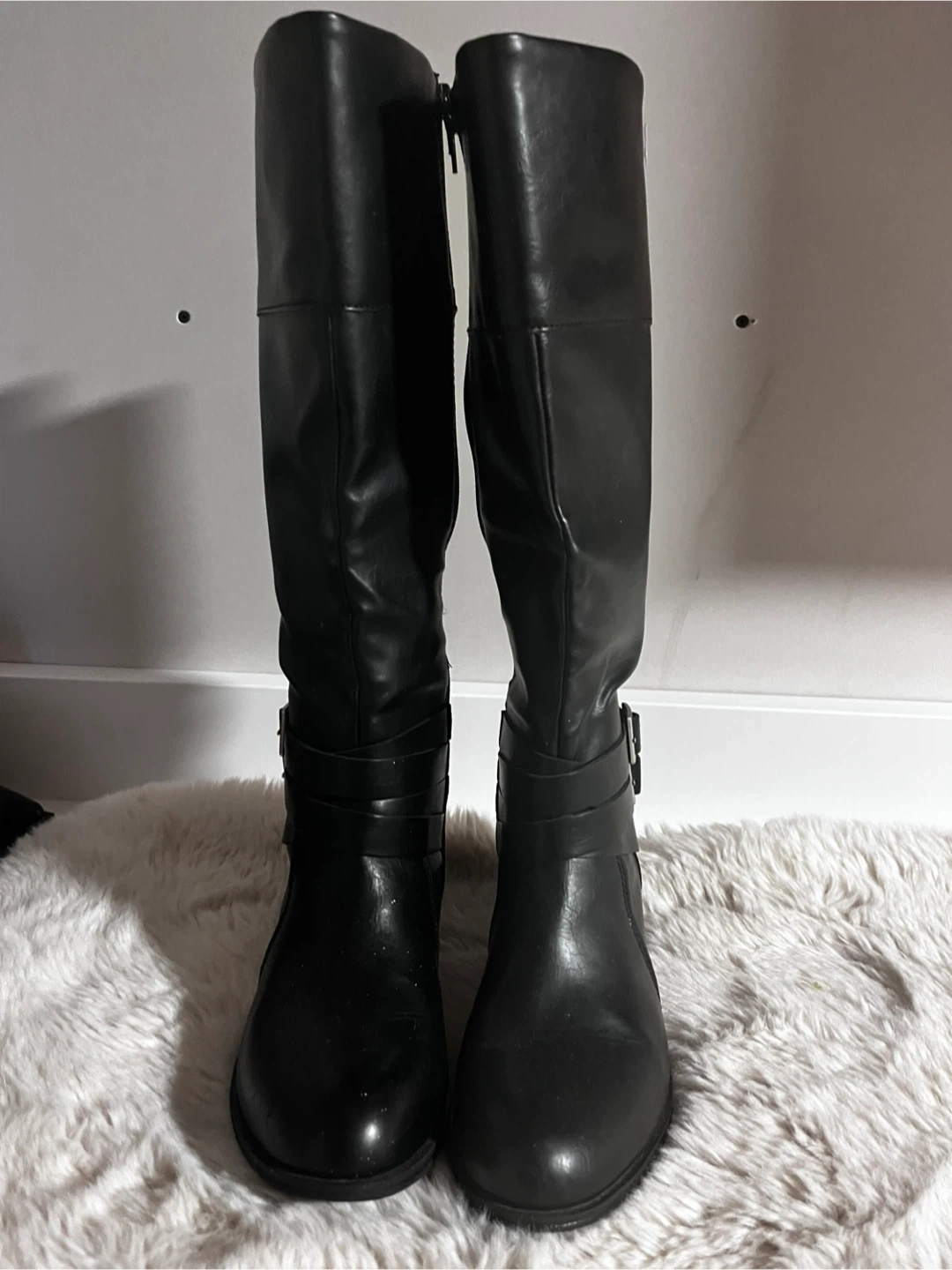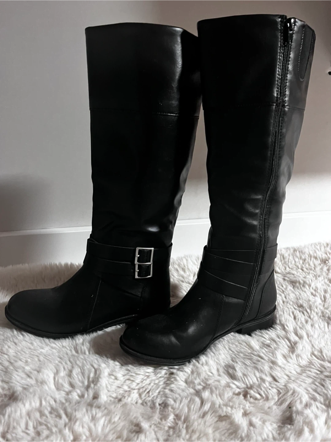 These are a pair of black knee-high riding boots. They feature a buckle detail and a full-length zipper on the side. They are in good condition!