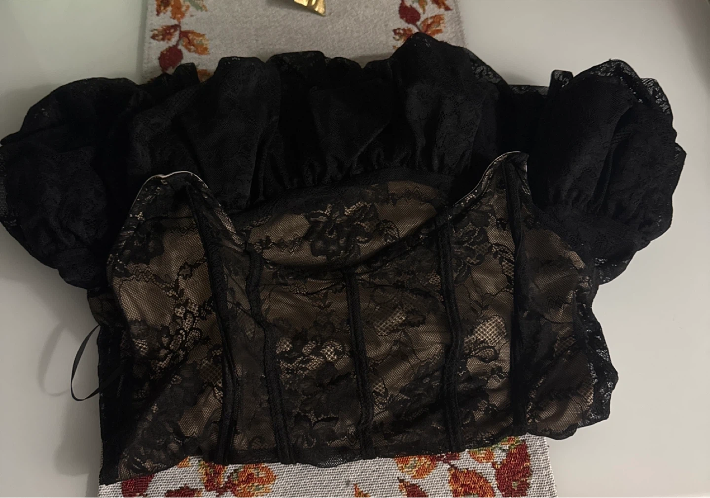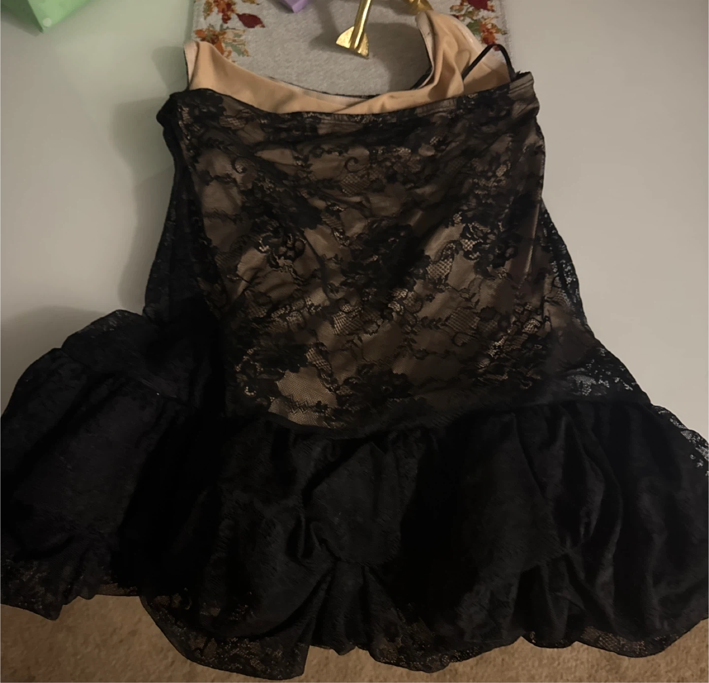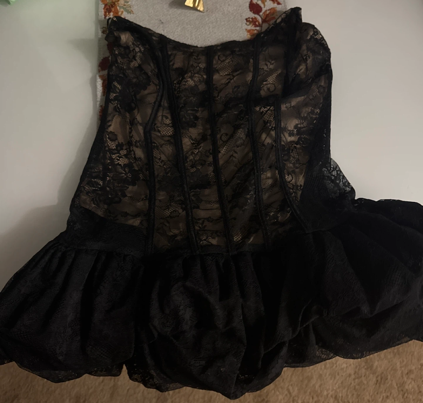 Selling a cute black lace mini dress! It features a lace bodice and a ruffled skirt. Perfect for a night out or a special occasion