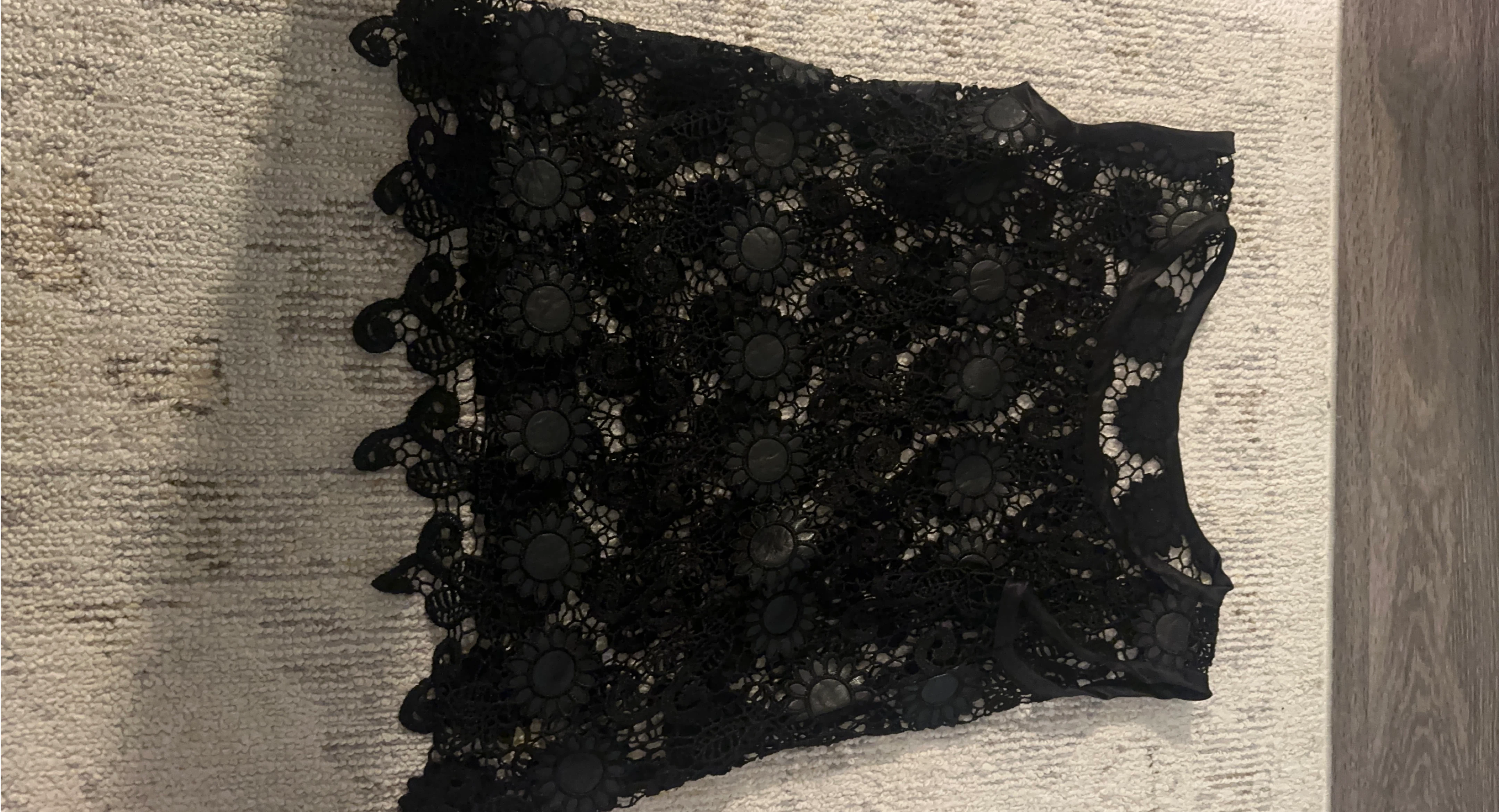 Here is a black lace top. It features a floral pattern and would be a great addition to your wardrobe!