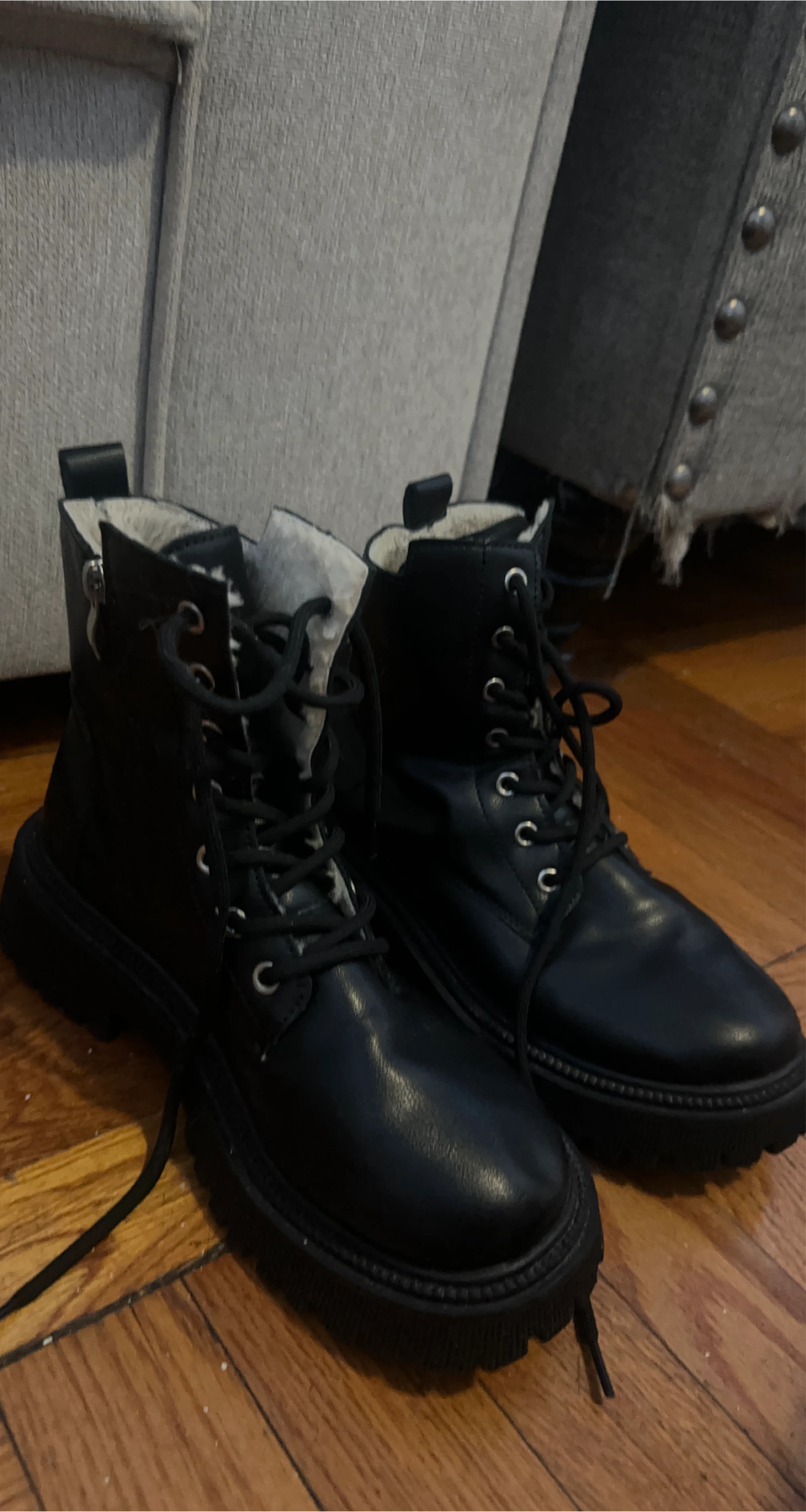 65Selling a pair of black lace-up ankle boots. They appear to be in good condition and have a lug sole. Perfect for fall or winter!
