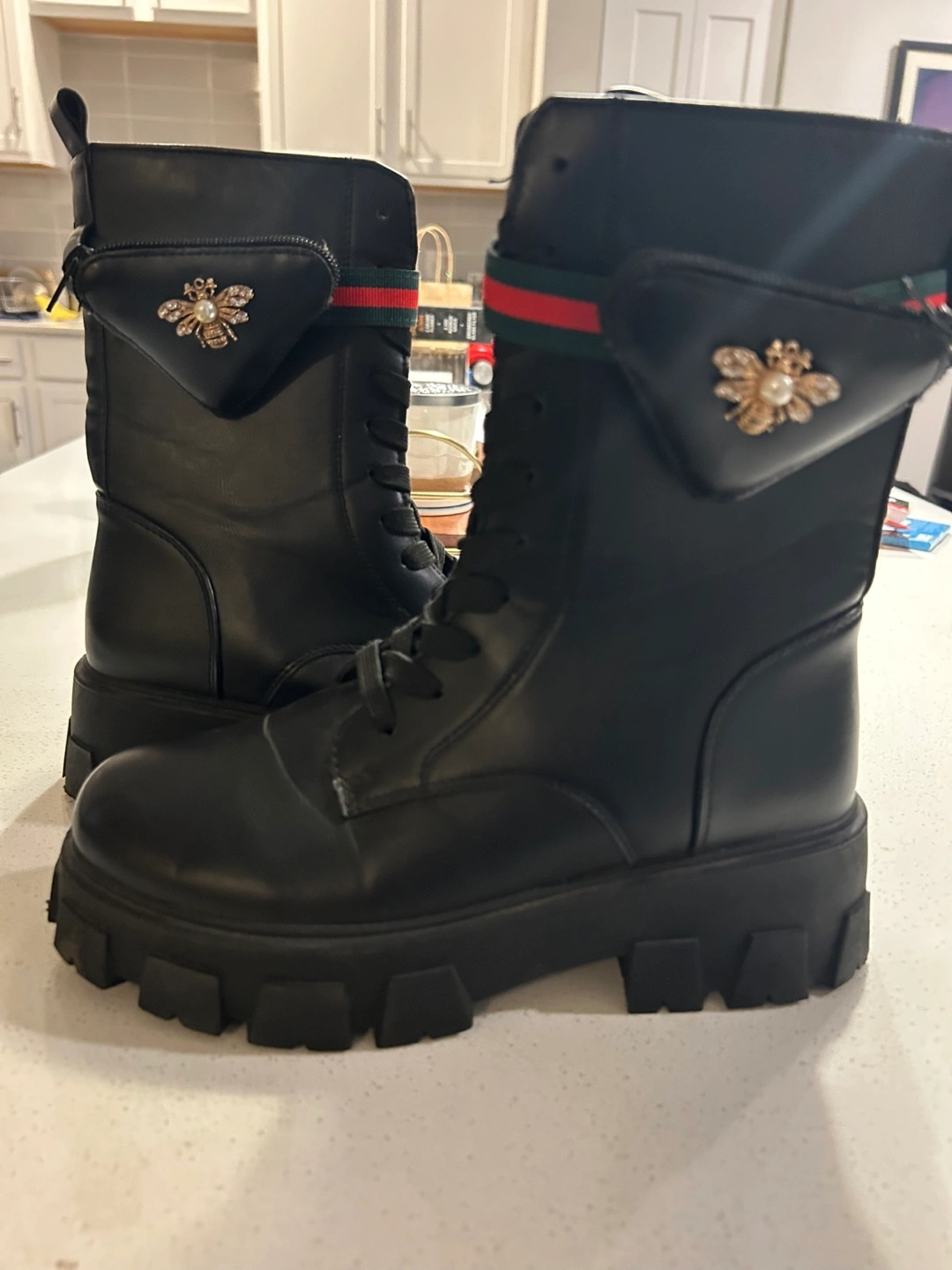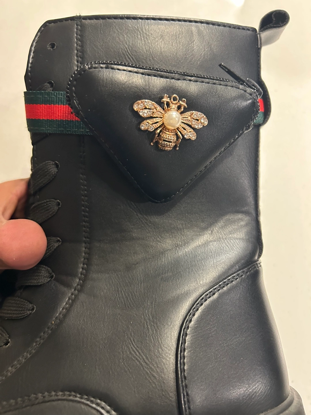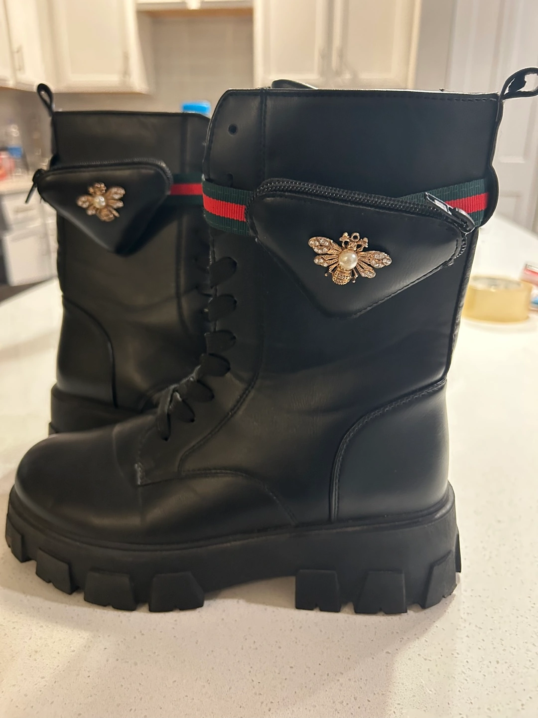 These are a pair of black lace-up combat boots. They feature a chunky lug sole and a decorative bee embellishment on a small pouch detail. The boots also have a red and green stripe accent.