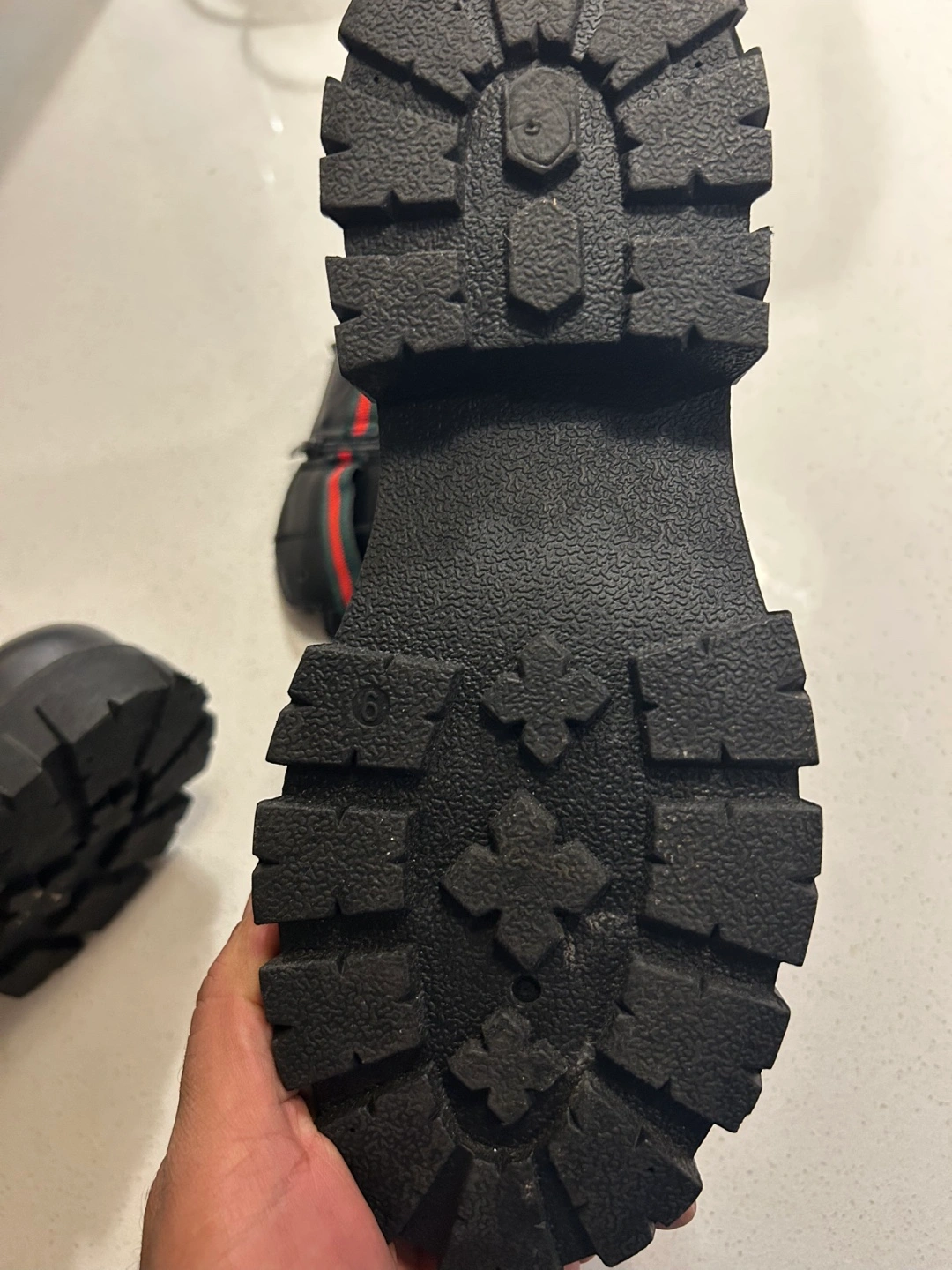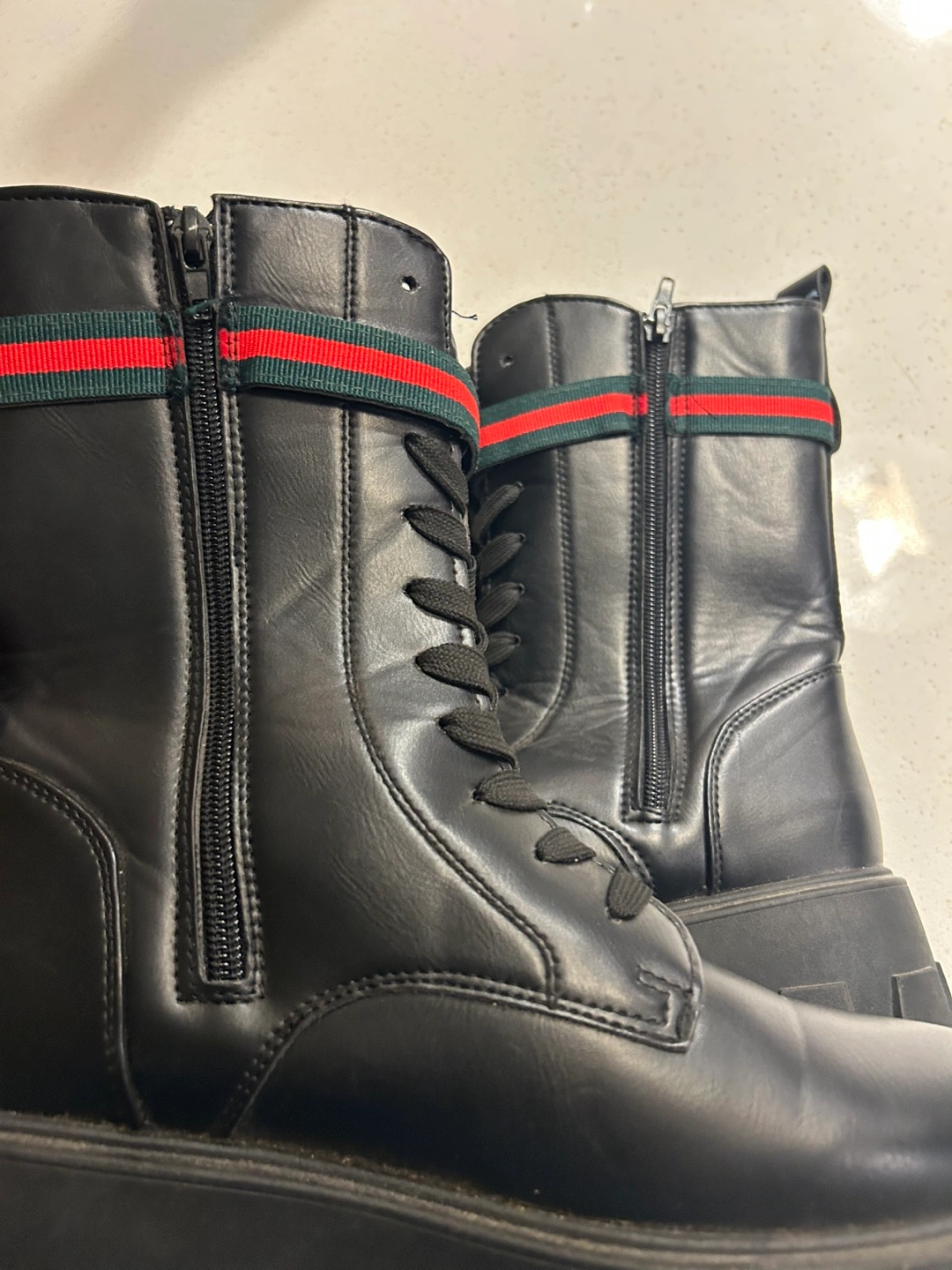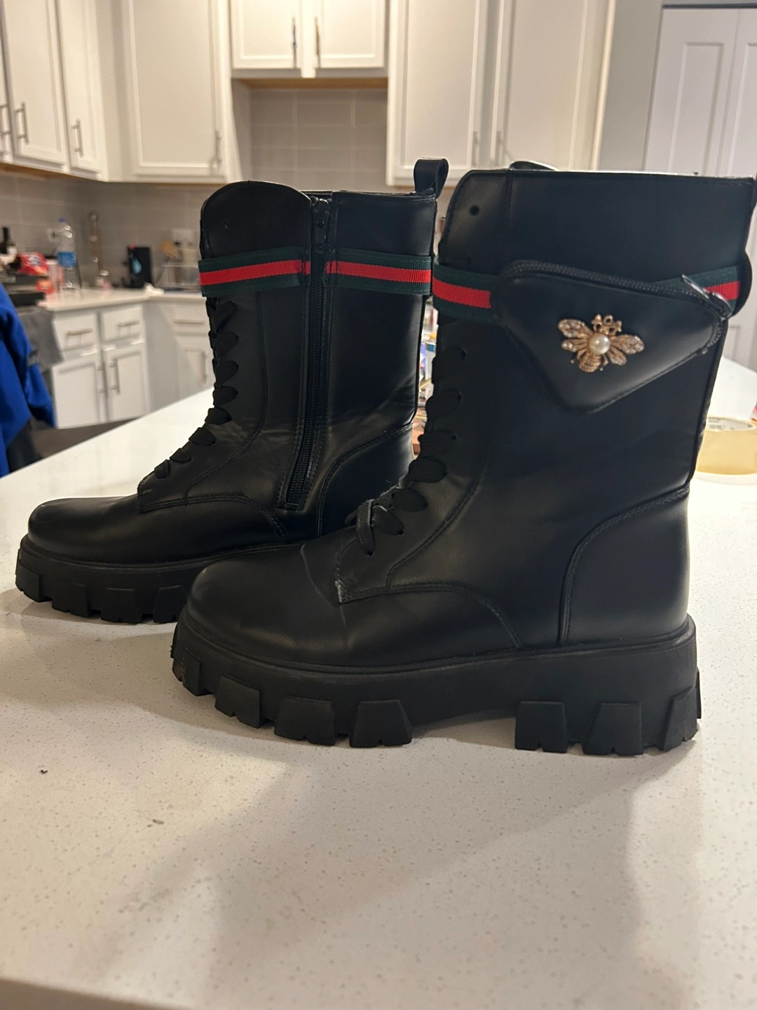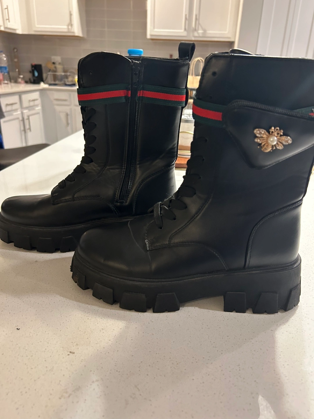 These are a pair of black lace-up combat boots. They feature a chunky lug sole and a decorative bee embellishment on a small pouch detail. The boots also have a red and green stripe accent.