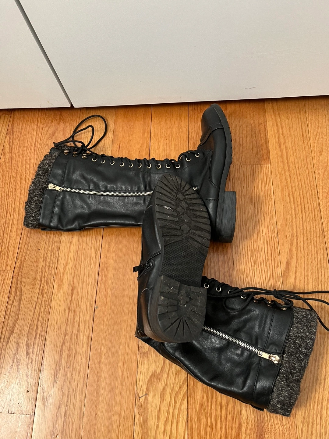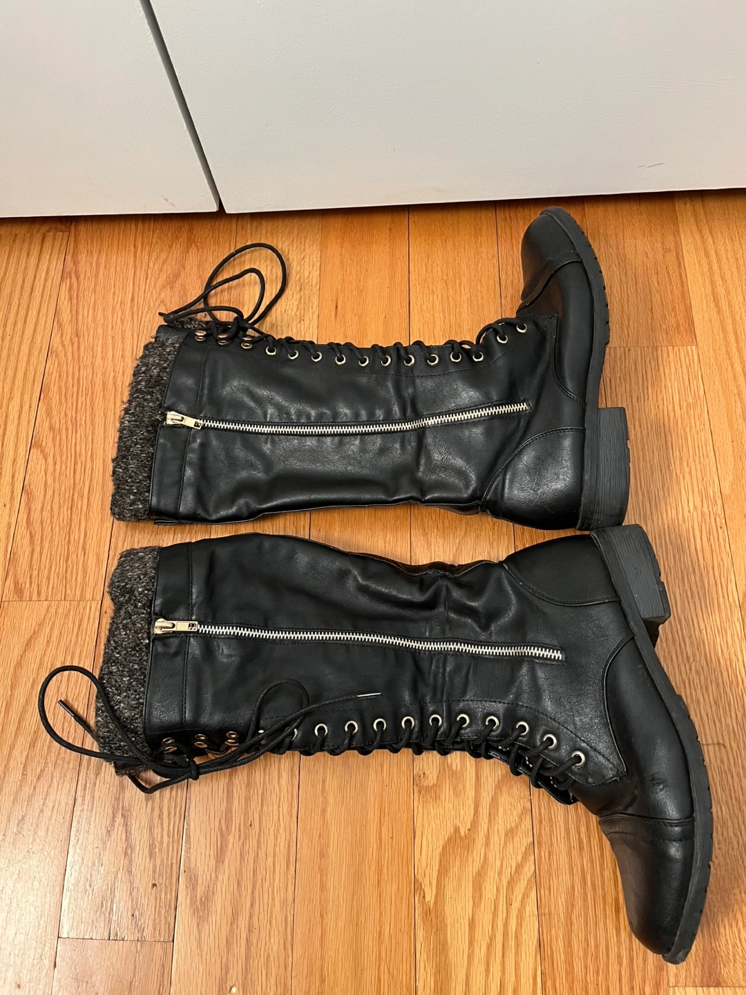 Pair of black knee-high boots. Features lace-up front and side zipper. Warm knit cuffs. Slightly worn soles.
