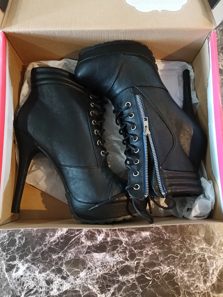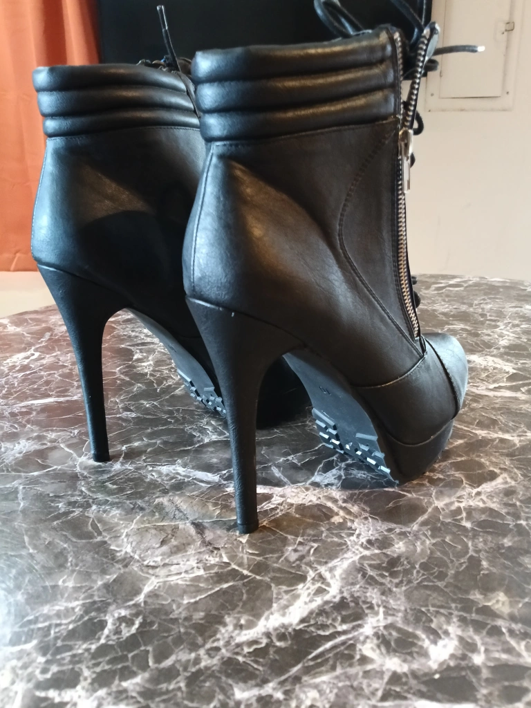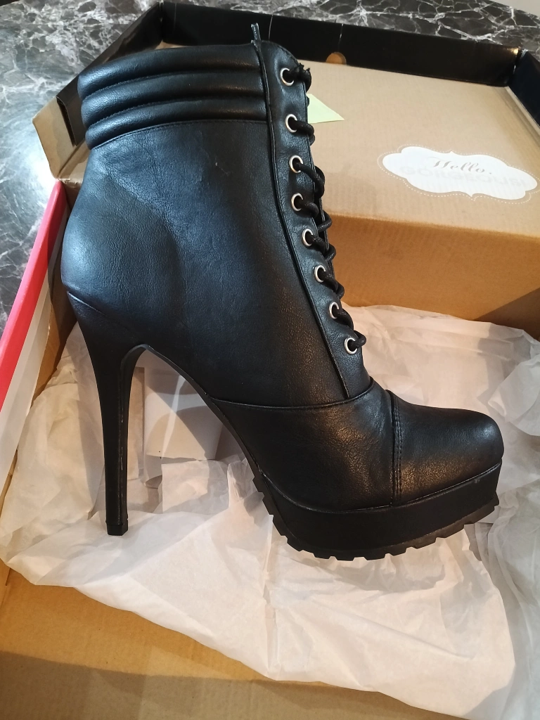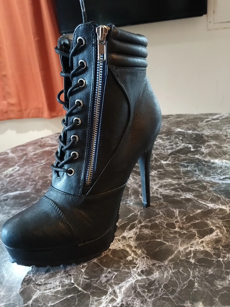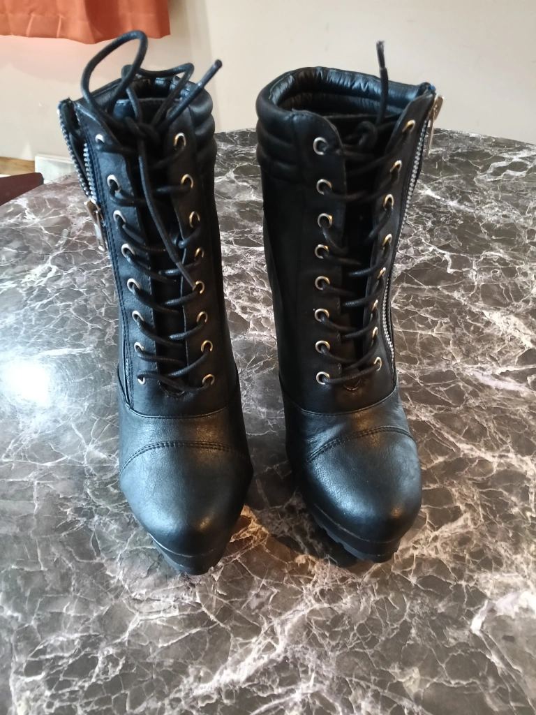 Selling a pair of black lace-up platform heel booties. They come in the original box! These stylish boots feature a lace-up front, side zipper detail, and a sleek platform heel. Perfect for adding a bit of edge to any outfit!