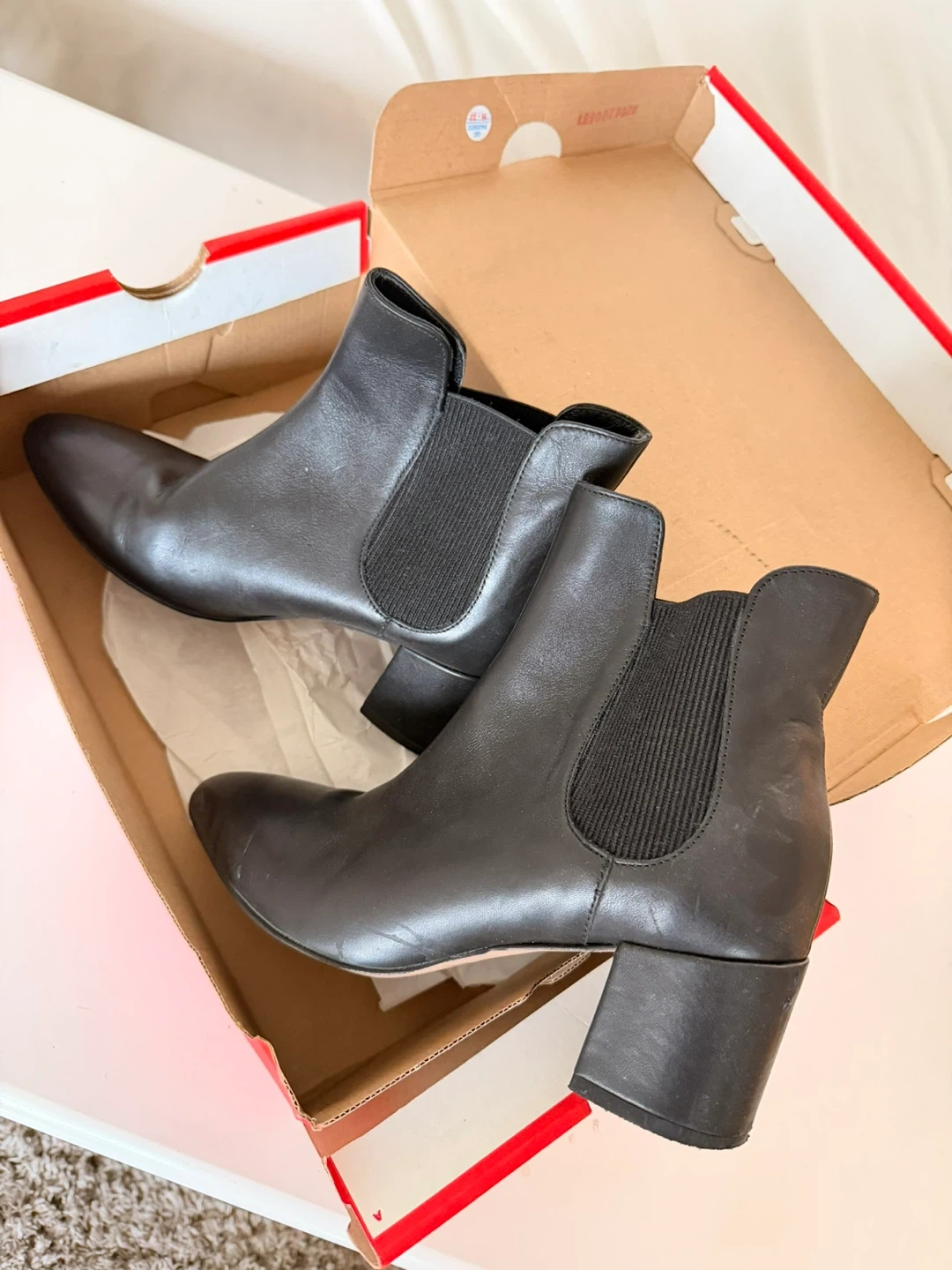 15These are a pair of black leather ankle boots in size 7 (Italian size 37). They show some signs of wear on the soles, but the uppers are in good condition. They come with the original box