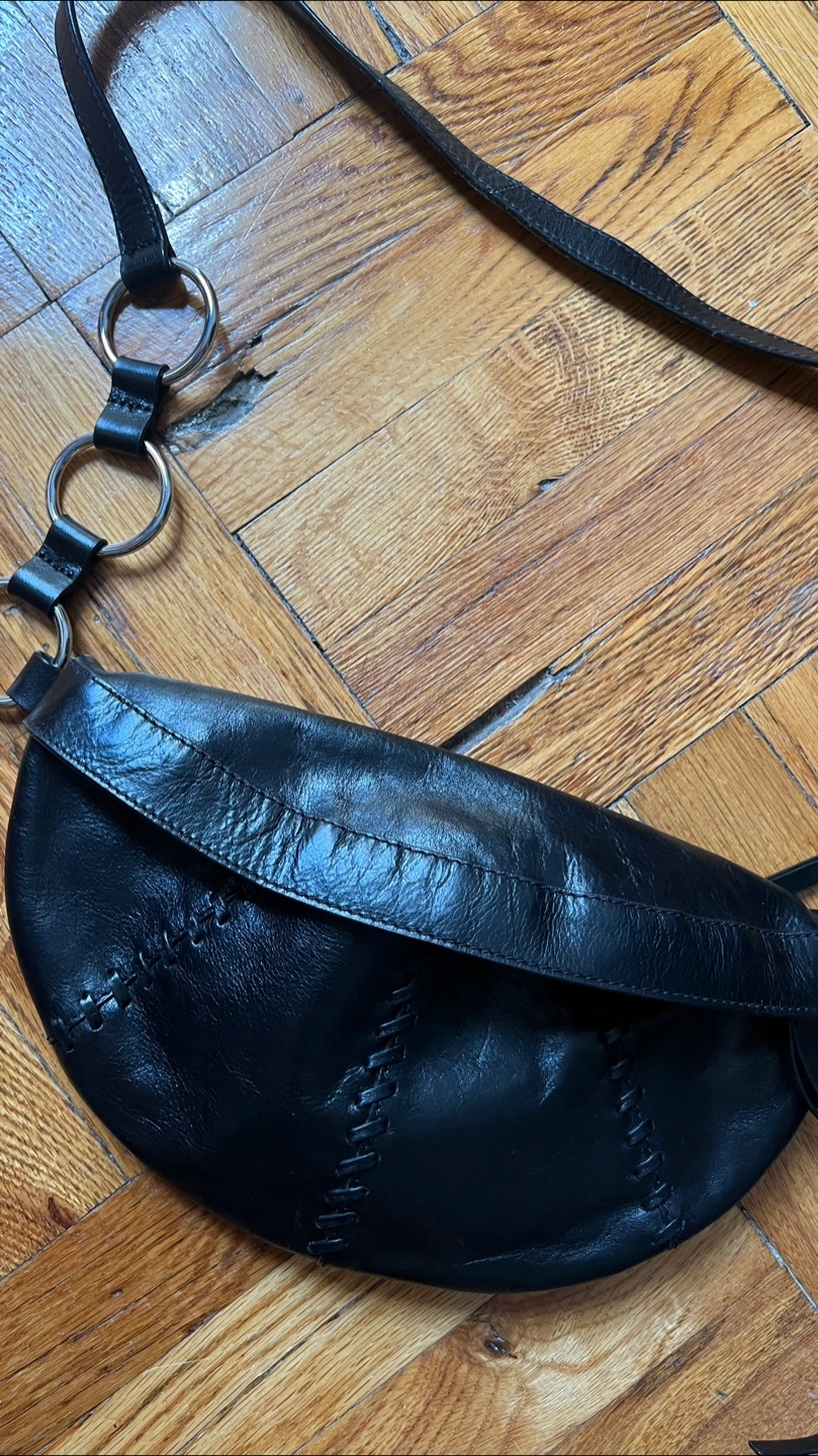 Selling a stylish black leather crossbody bag! It features a unique half-moon shape with decorative stitching and silver-tone ring details on the strap. Perfect for adding a touch of edgy sophistication to any outfit!