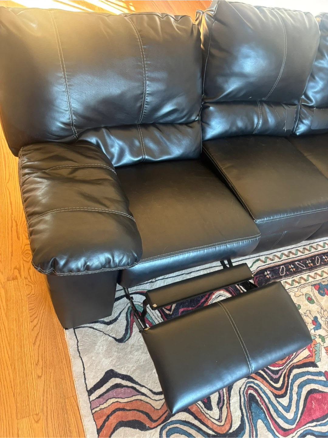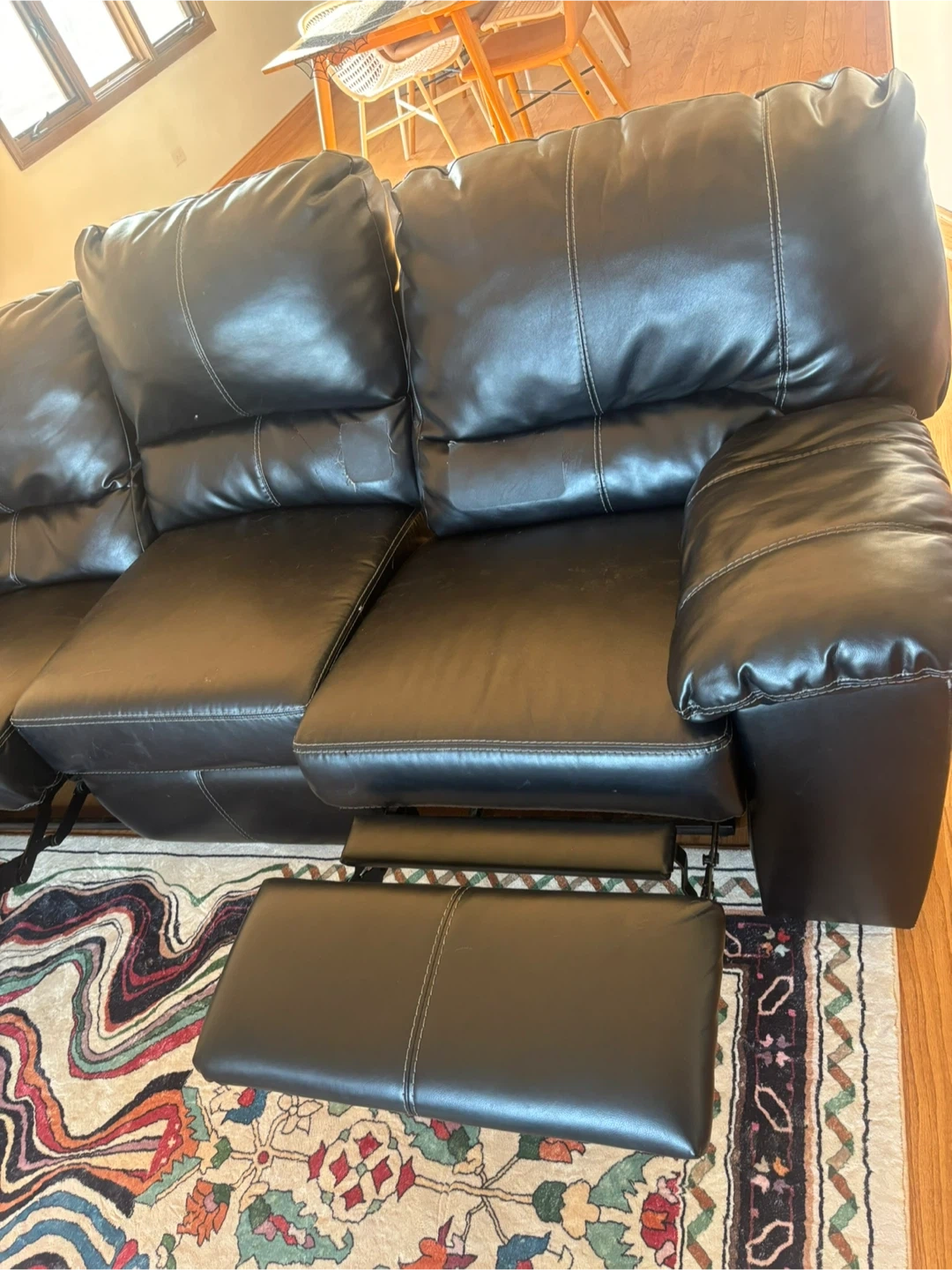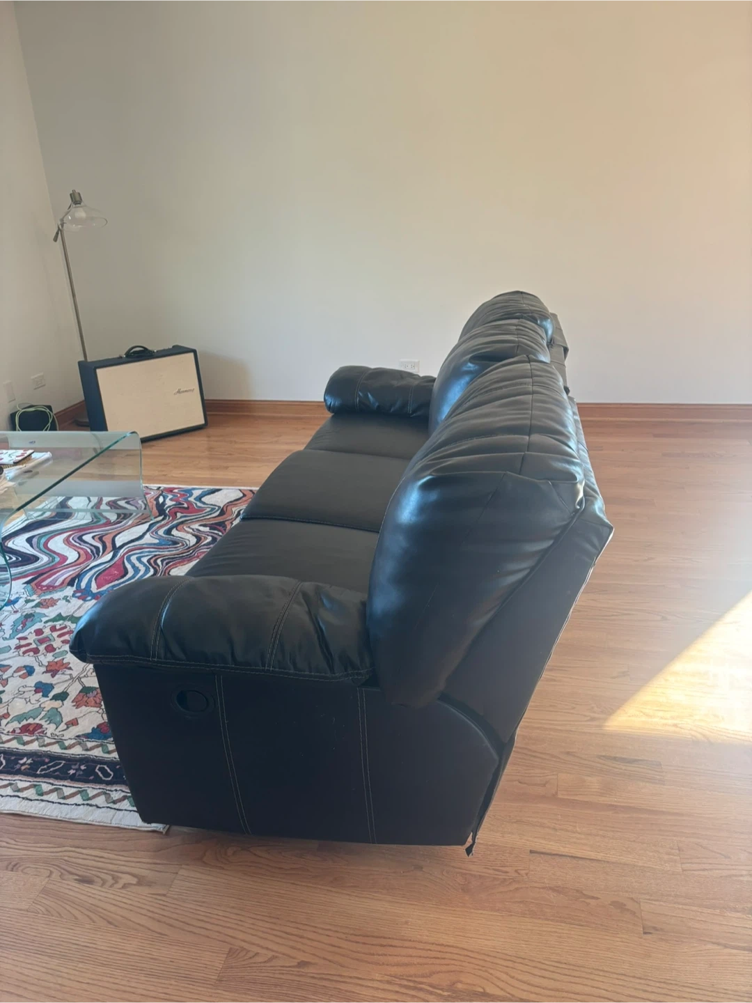 Selling a comfortable black leather reclining sofa. It's in good condition and ready for a new home. Perfect for relaxing after a long day! See last picture some damage but covered with matching cover so it very noticeable.