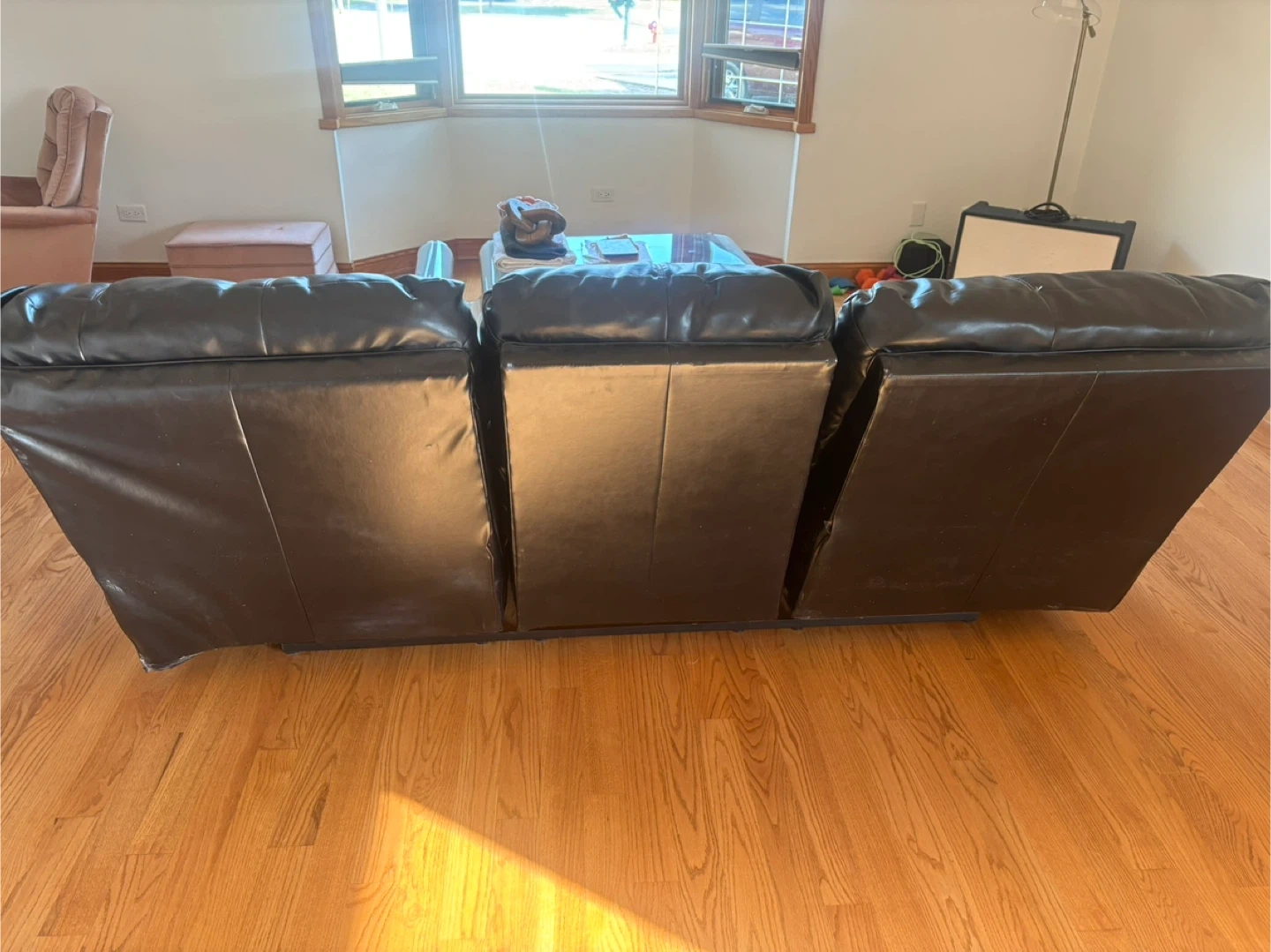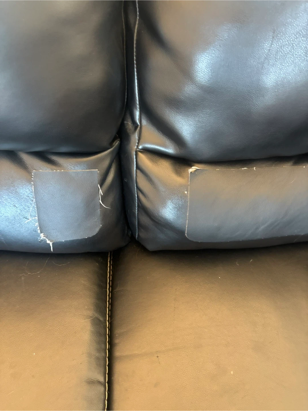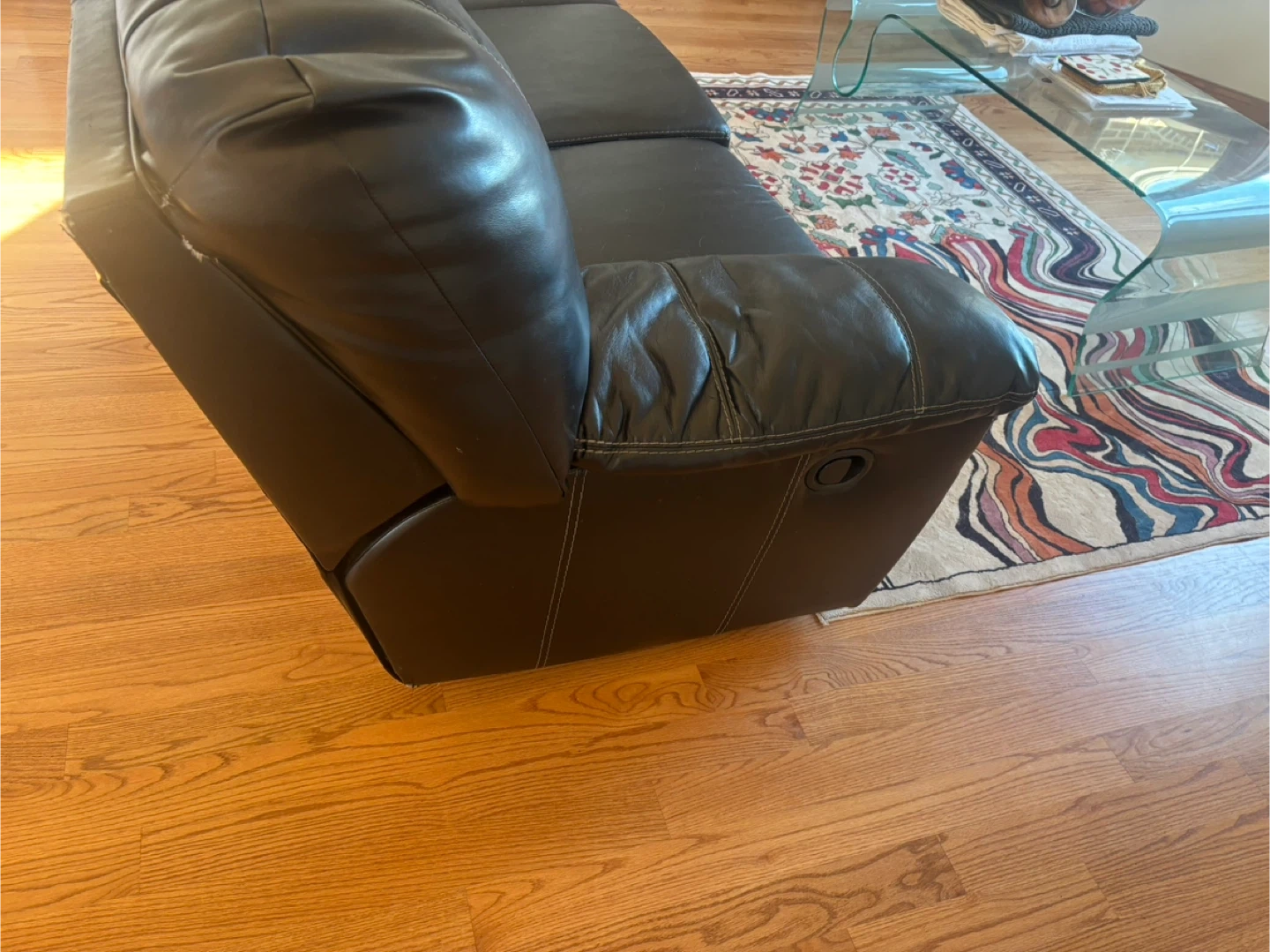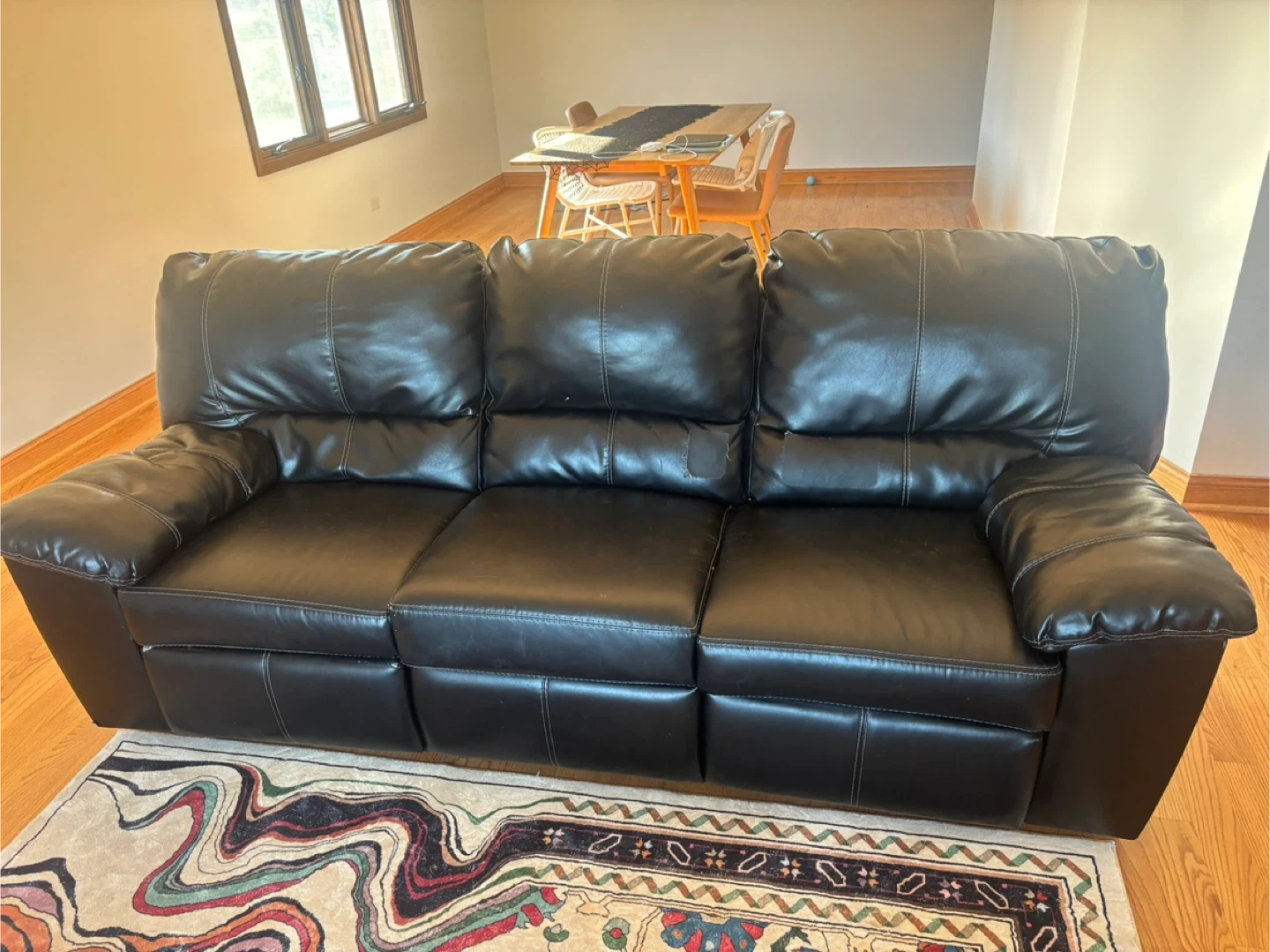 Selling a comfortable black leather reclining sofa. It's in good condition and ready for a new home. Perfect for relaxing after a long day! See last picture some damage but covered with matching cover so it very noticeable.