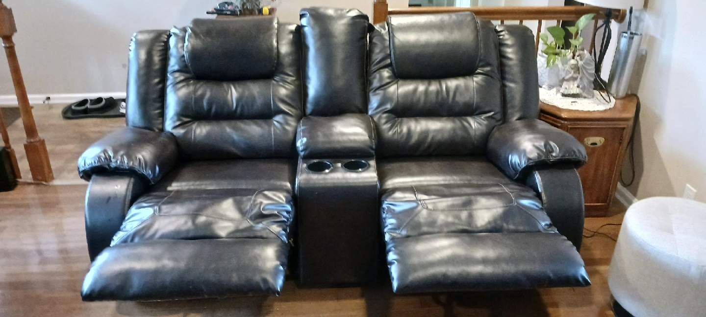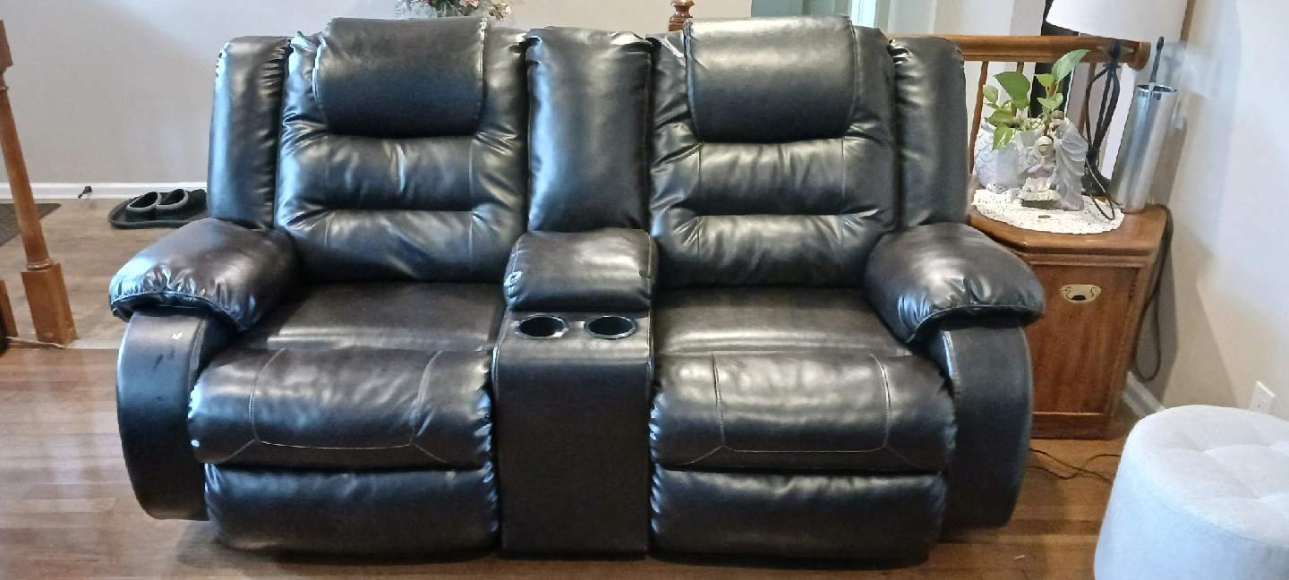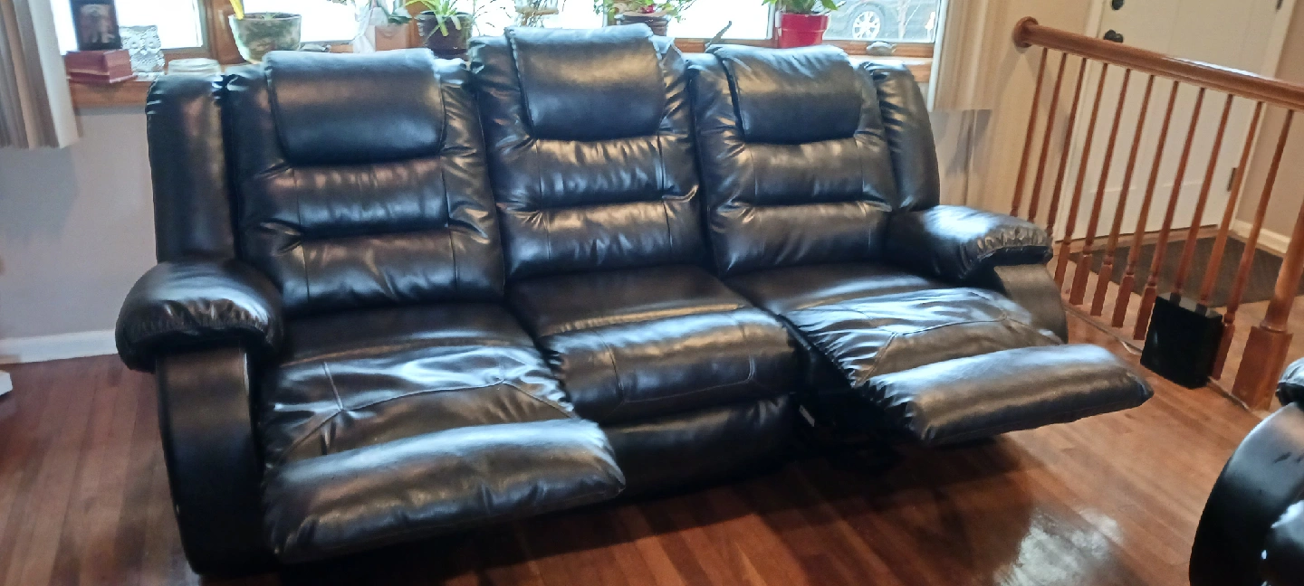 Selling a comfortable black leather reclining sofa and loveseat. They're in good condition and ready for a new home! The sofa has three seats and the loveseat has two, with a center console and cupholders.