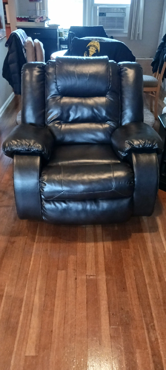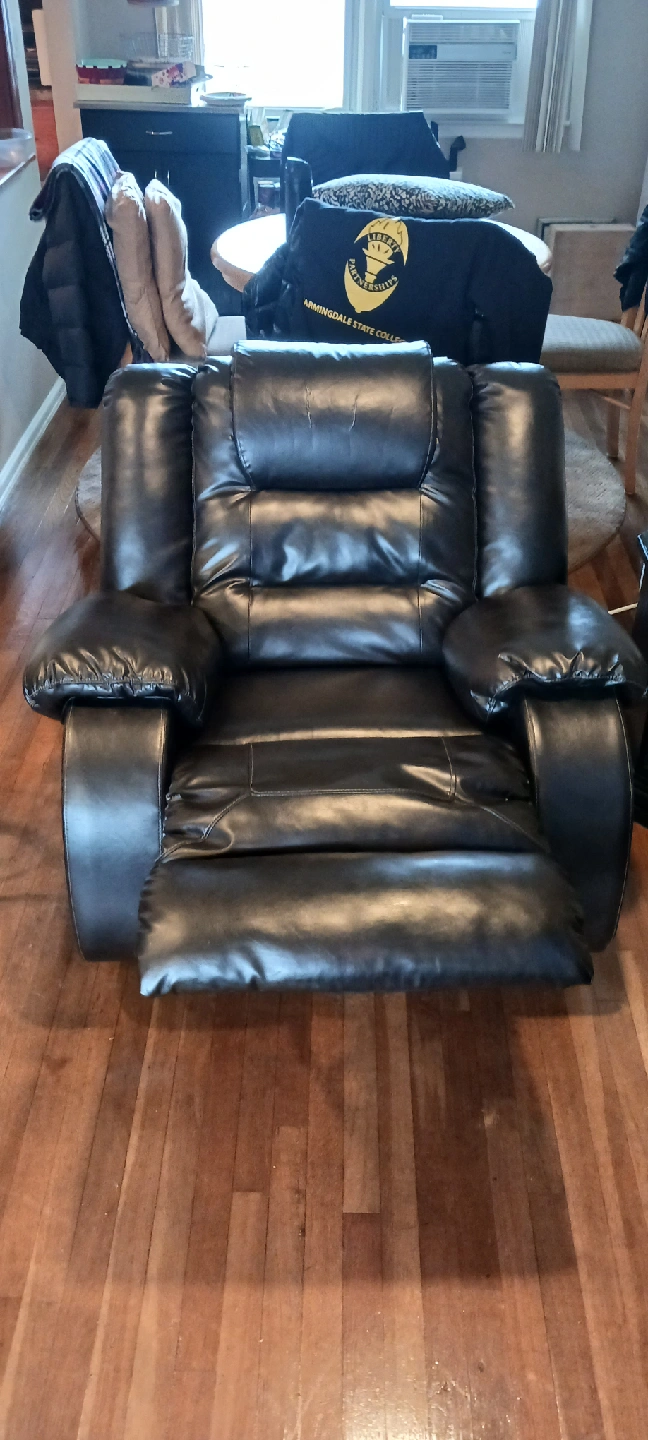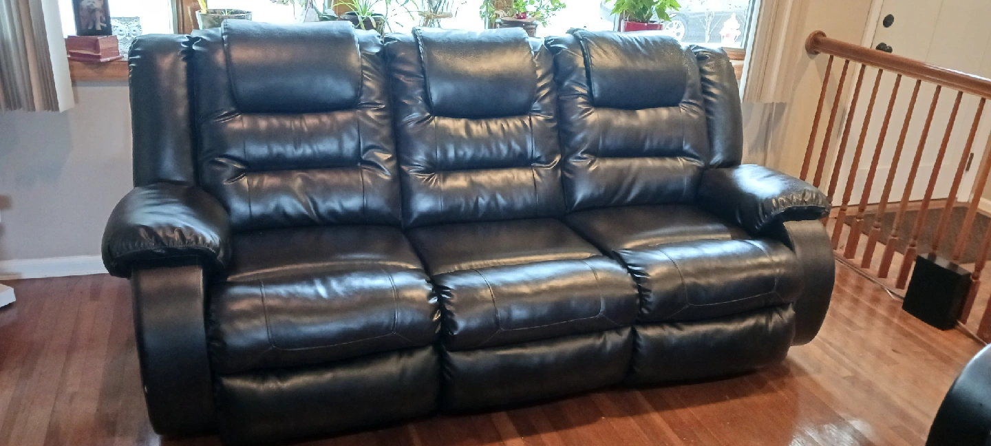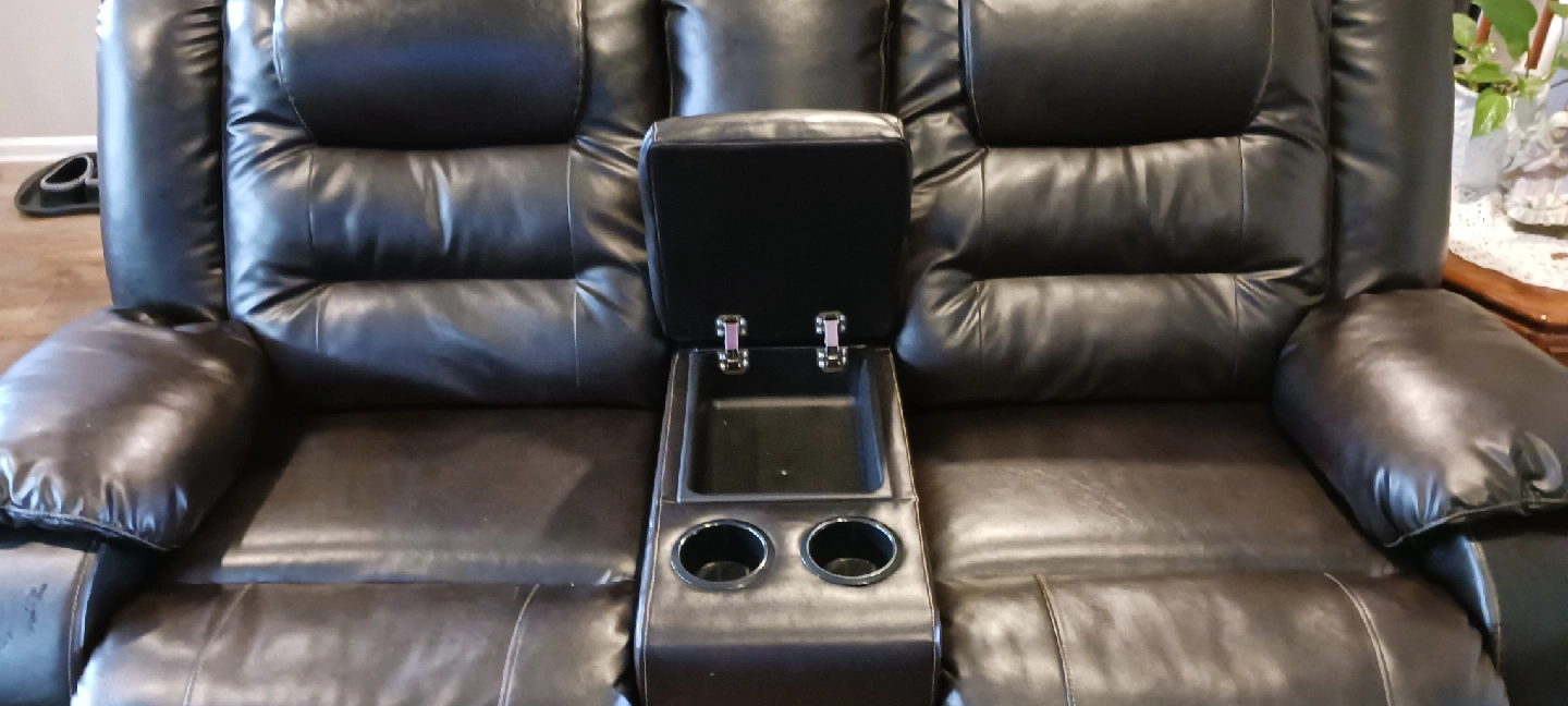 Selling a comfortable black leather reclining sofa and loveseat. They're in good condition and ready for a new home! The sofa has three seats and the loveseat has two, with a center console and cupholders.