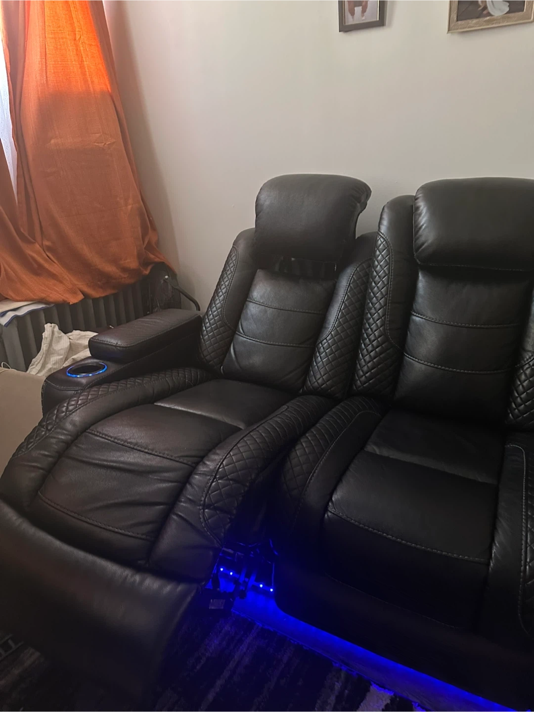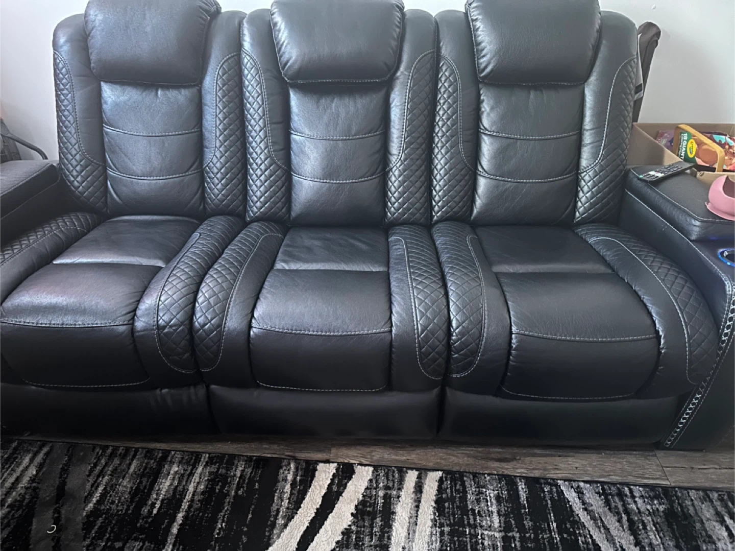 60Selling a black leather reclining sofa. It looks like it’s in great condition and ready for a new home! Perfect for movie nights or just relaxing after a long day. The sofa features a stylish design with diamond stitching and built-in cup holders for added convenience