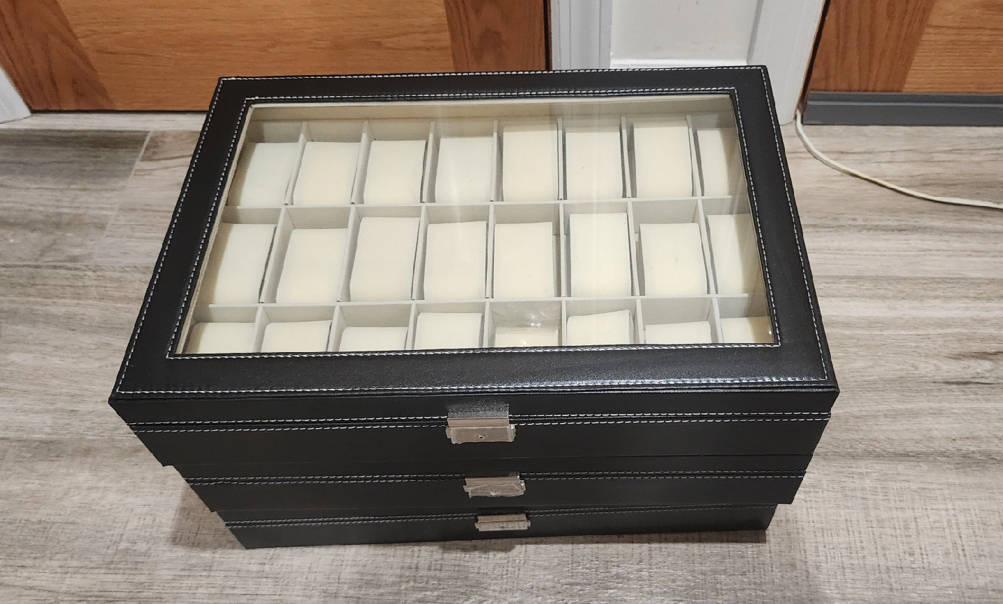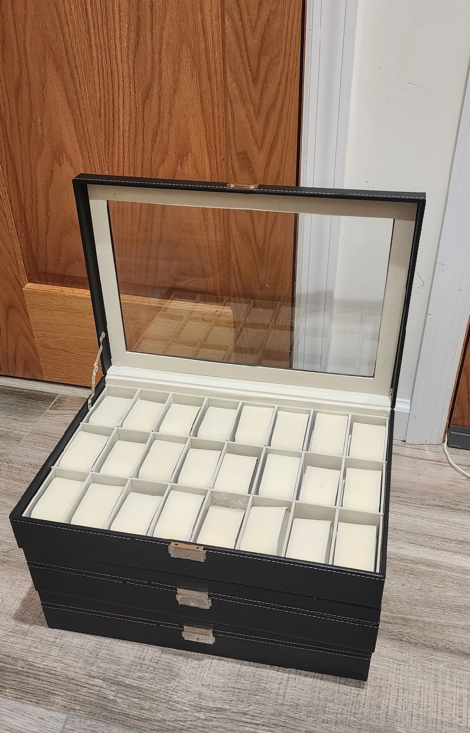 Selling (1) black leather watch box organizer! It has a clear glass top and 24 compartments with soft cushions to keep your watches safe and organized. Perfect for storing and displaying your watch collection