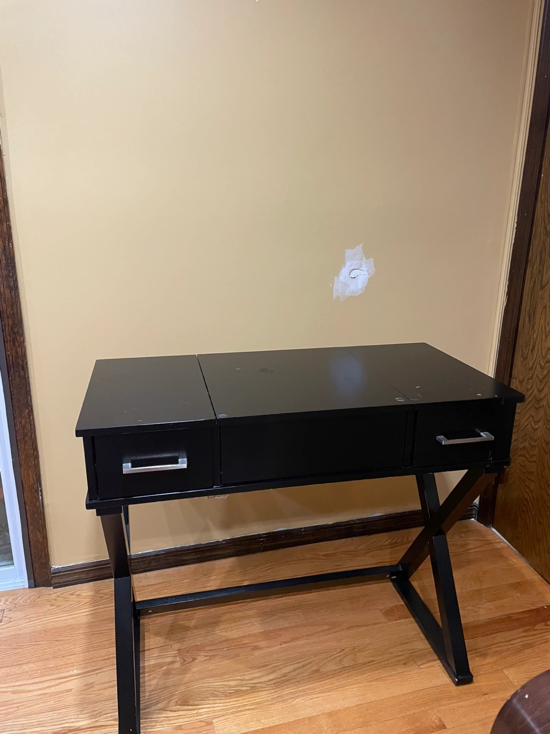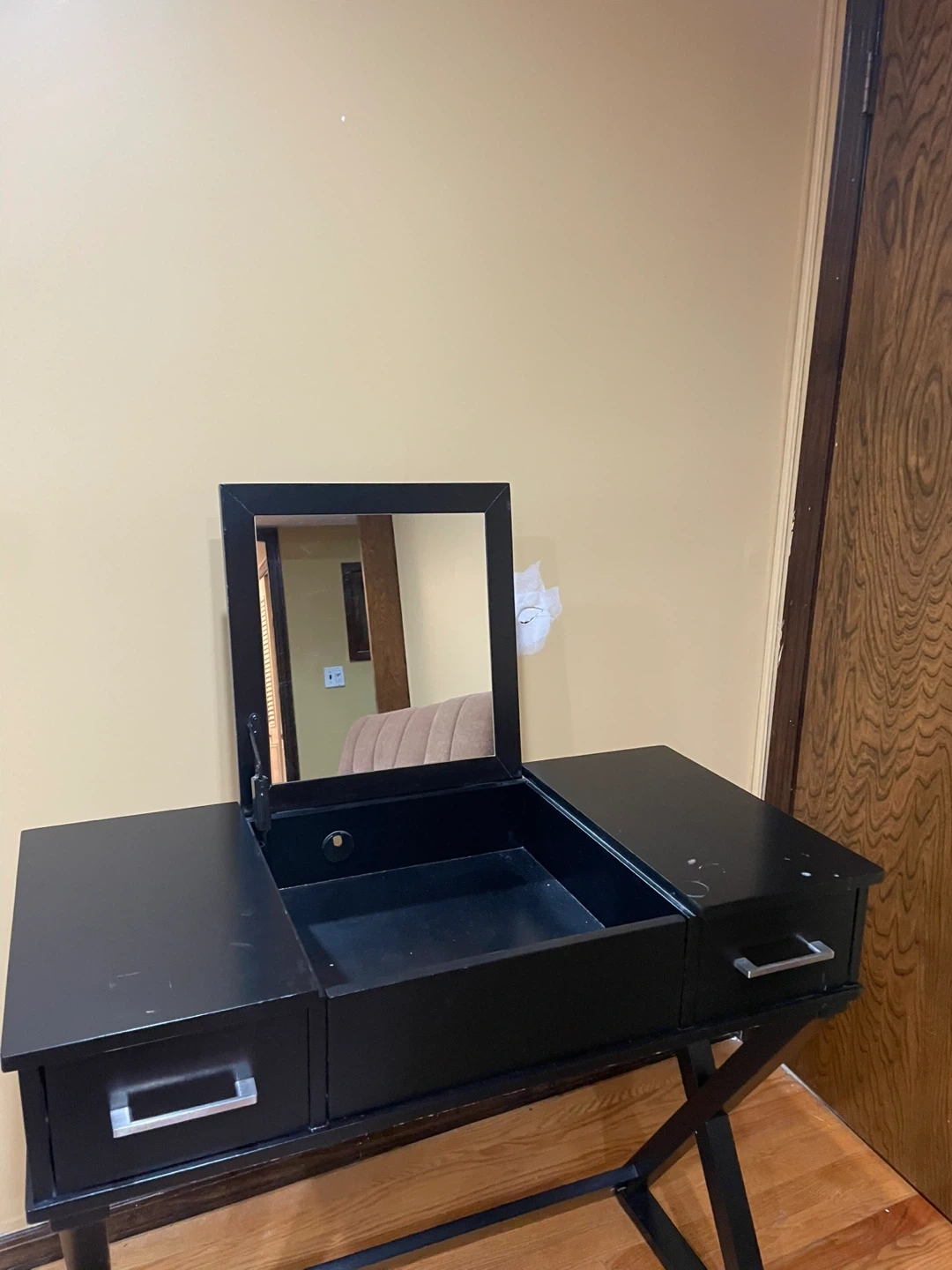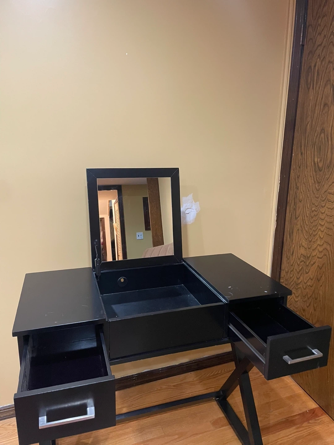 Black Vanity Desk with Mirror – Sleek and functional piece featuring two drawers for storage and a flip-top mirror. Can be used as a makeup vanity or writing desk. Sturdy design with modern metal handles.