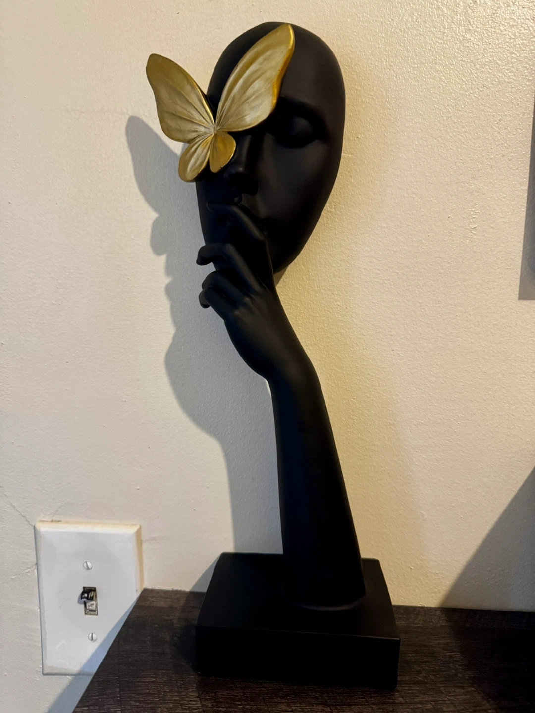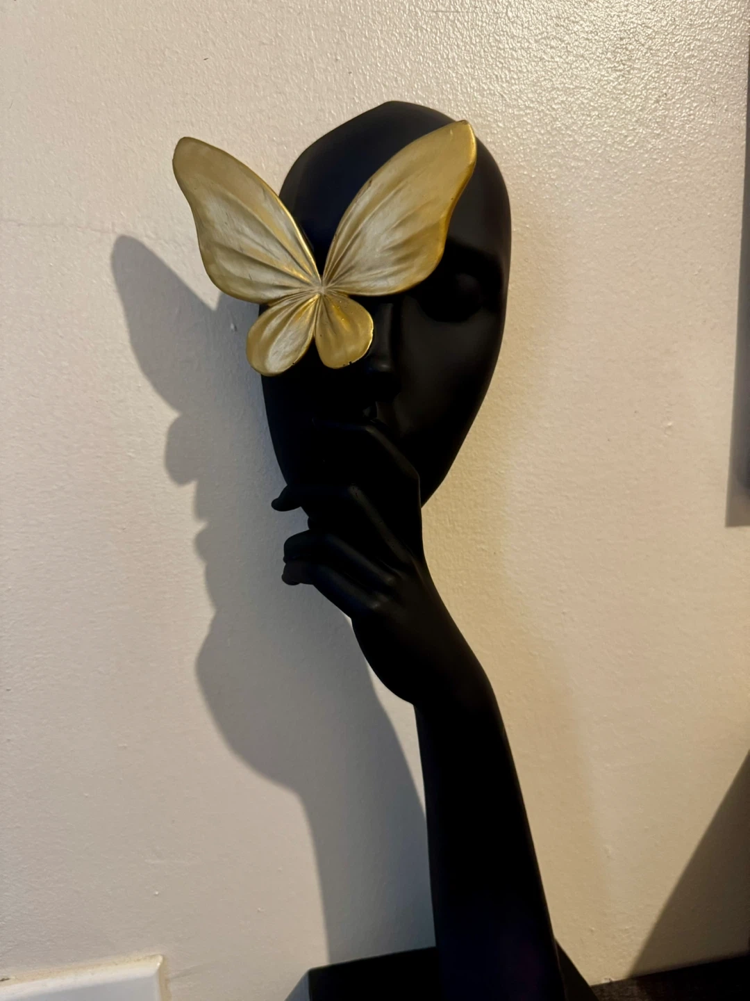 This is a striking black mannequin head featuring a beautiful gold butterfly accent. It's a unique decorative piece that can add a touch of elegance to any room. It's in great condition and ready to find a new home!