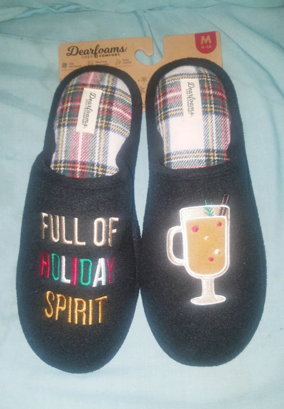 Holiday Spirit Theme Slippers Black with Plaid Inside Brand New w Tag Please See Pics...