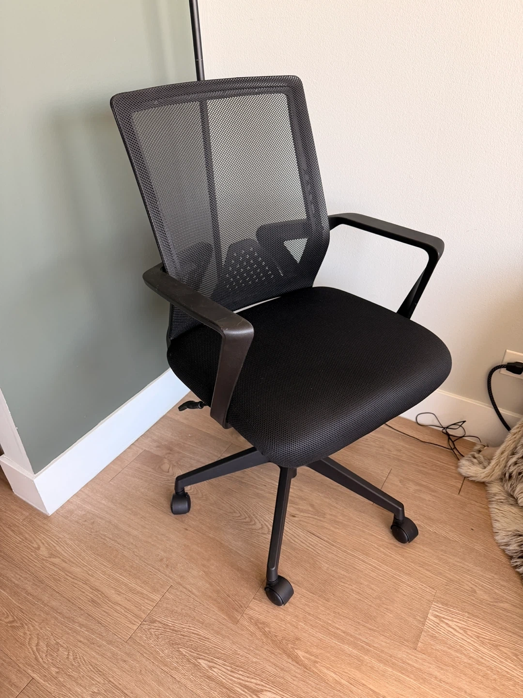95Selling a comfortable black mesh office chair. It's in great condition and ready to use. The mesh back provides good support and breathability. It has wheels for easy movement around your workspace.