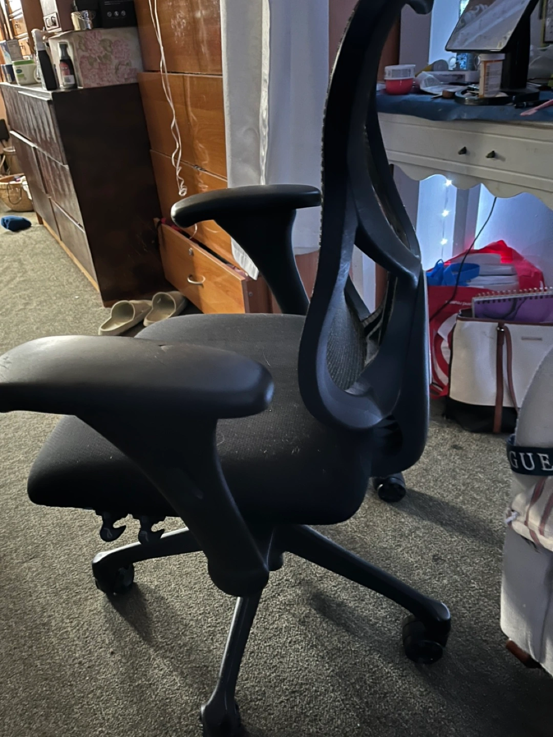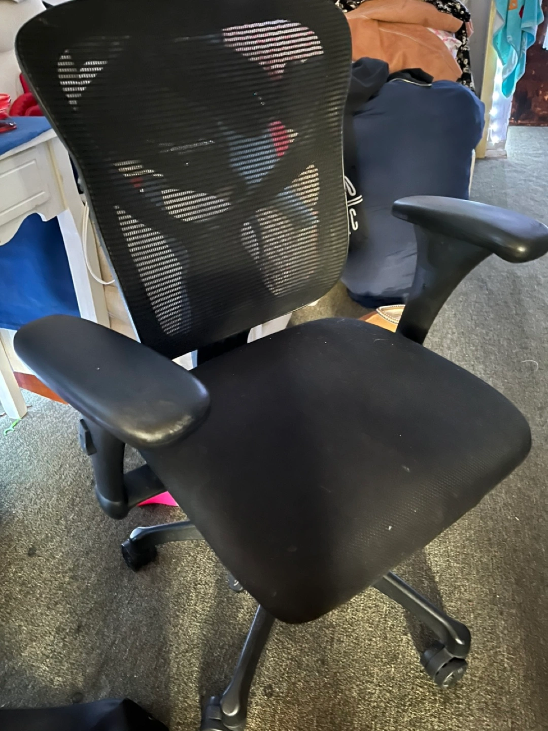 10Ergonomic office chair, black mesh back and seat. Adjustable arms and height. Good for home or office use. Wheels for easy mobility.