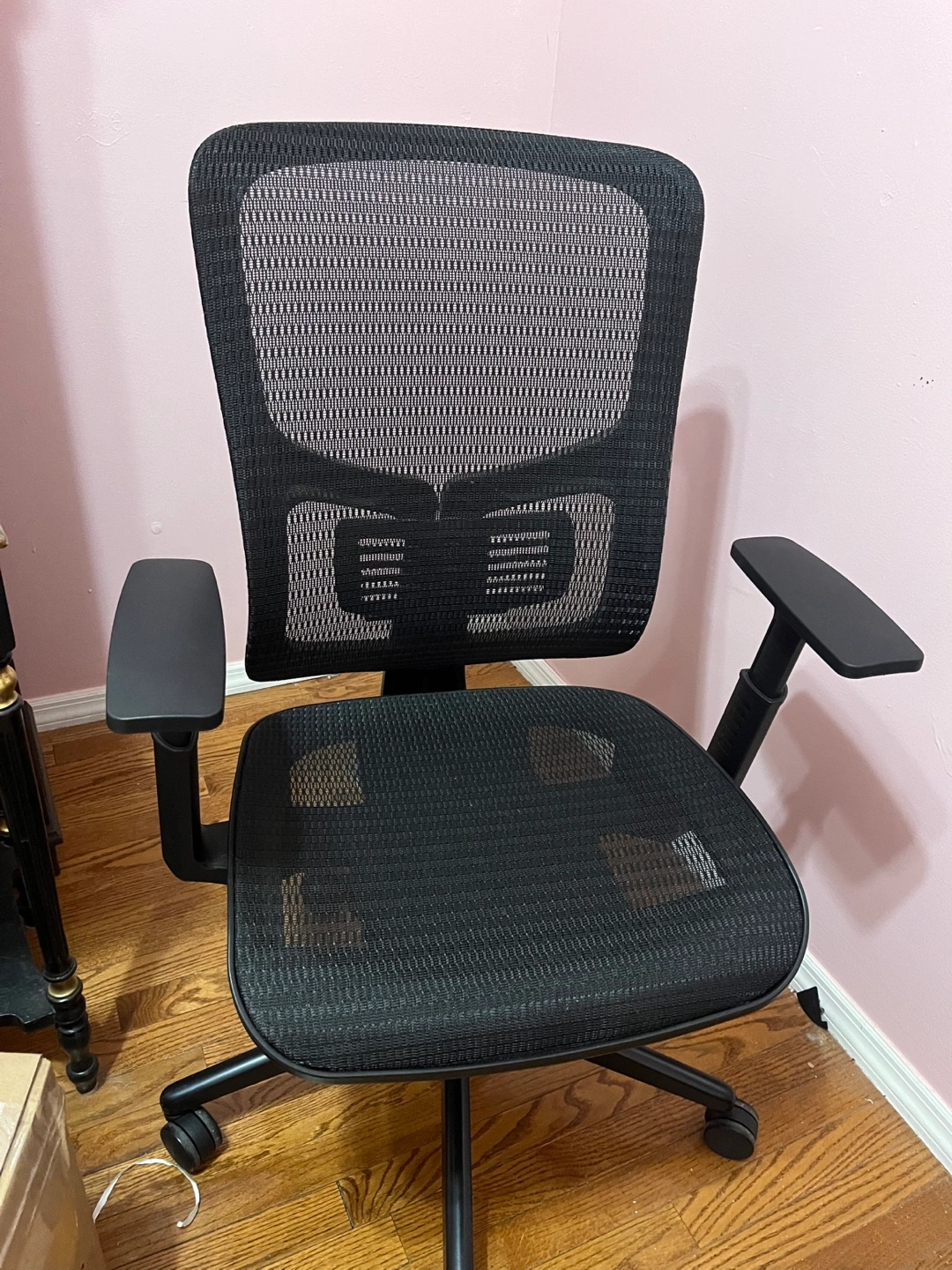 15Selling a black mesh office chair. It's in good condition and ready for a new home. The mesh back provides great support and breathability during long work sessions. It has adjustable armrests for added comfort too
