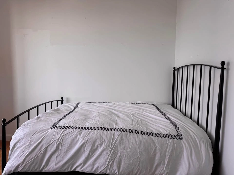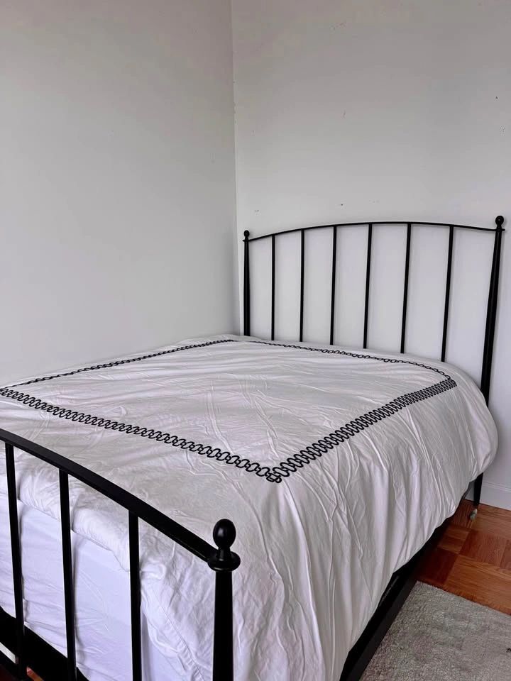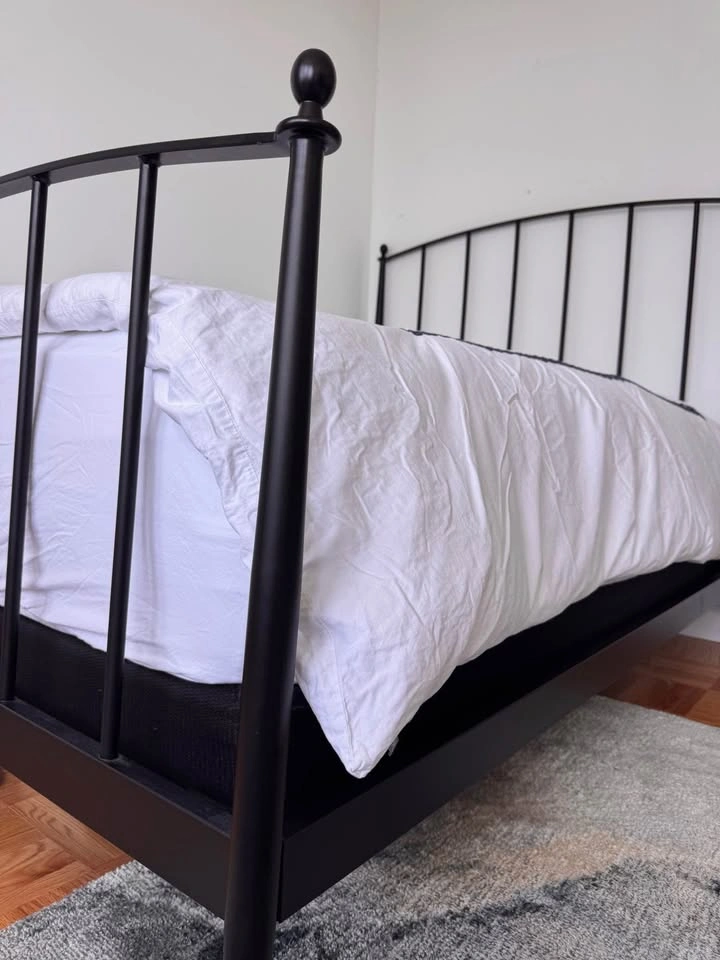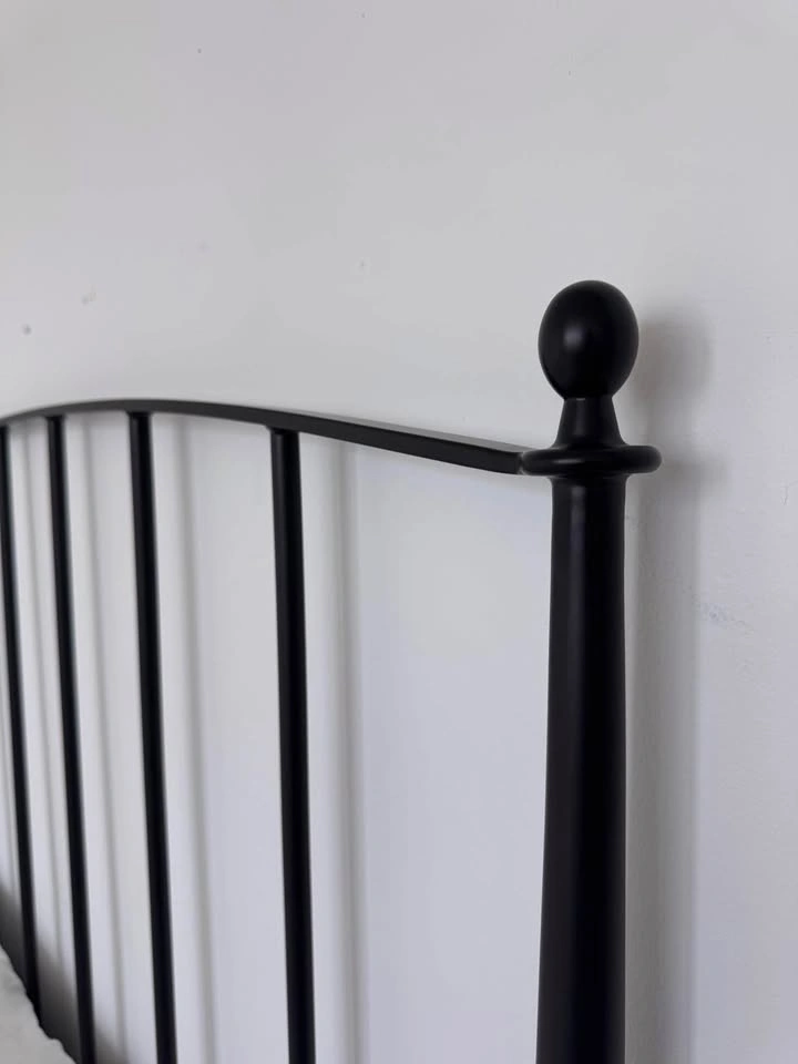 Sleek, modern black metal bed frame in excellent condition. Minimalist spindle design with rounded finials adds a timeless touch to any bedroom style. Sturdy steel construction with a matte black finish, built to last, scratch resistant, and easy to clean.