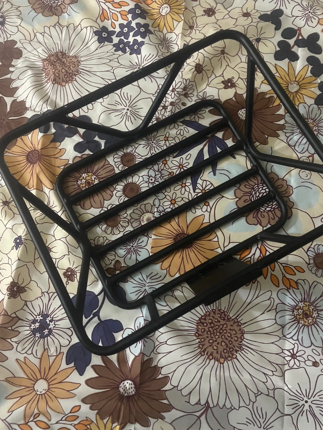 127Selling a black metal bike rack. It's in great condition and ready to use! It appears sturdy and well-made, perfect for carrying items on your bike