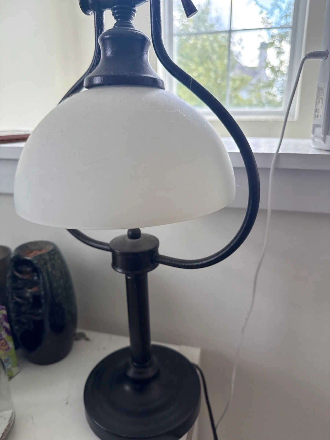 124Selling a desk lamp with a black metal base and a white glass shade. It's in great condition and perfect for adding some light to your workspace or bedside table! It has a simple, classic design that will fit in with any decor