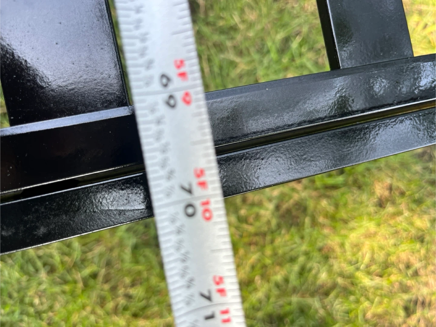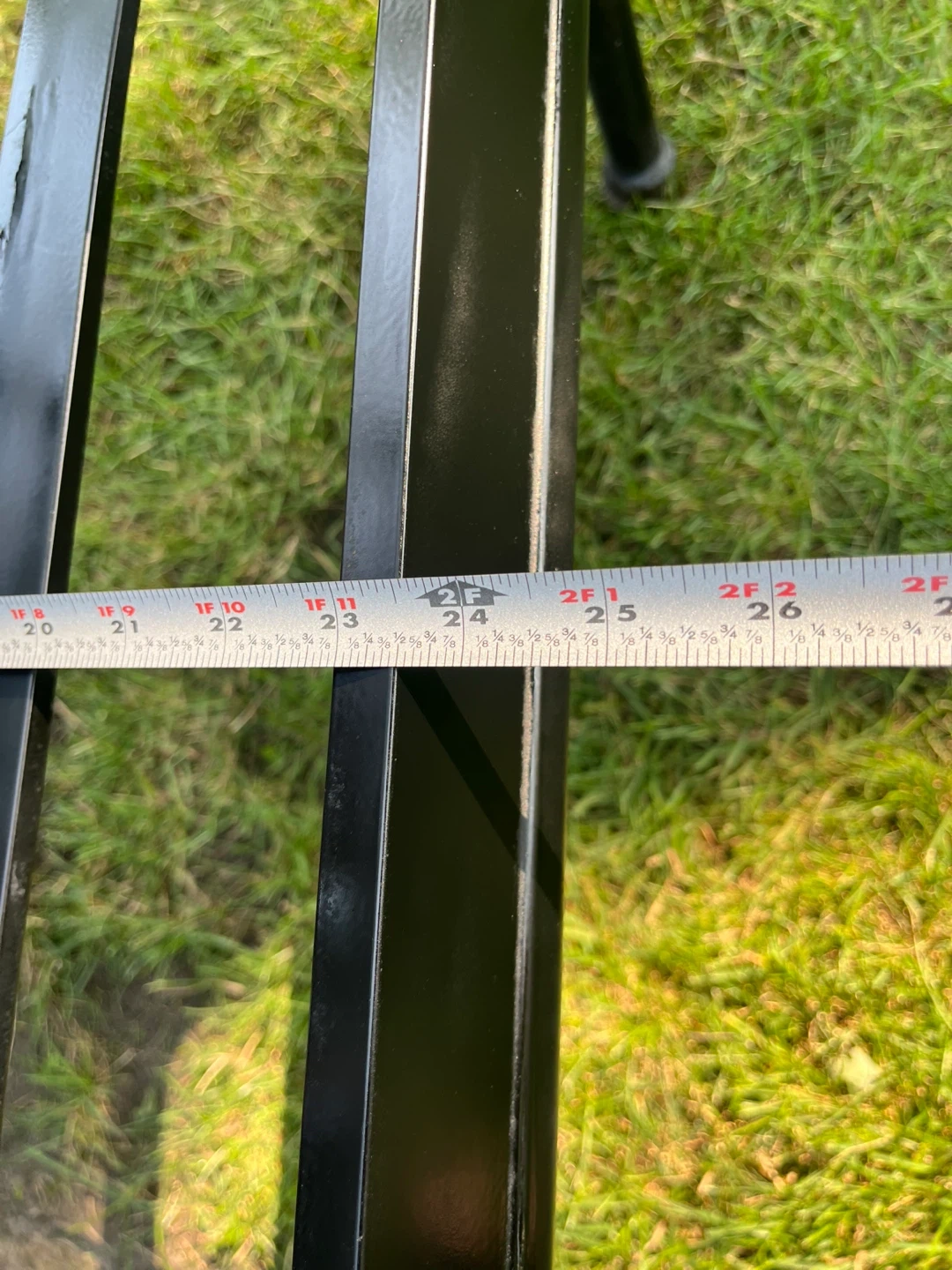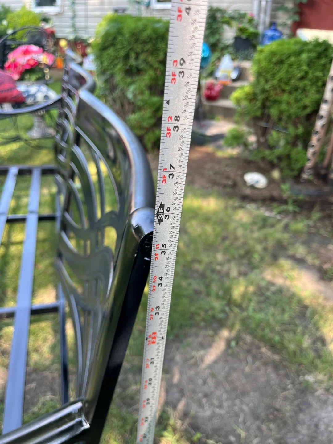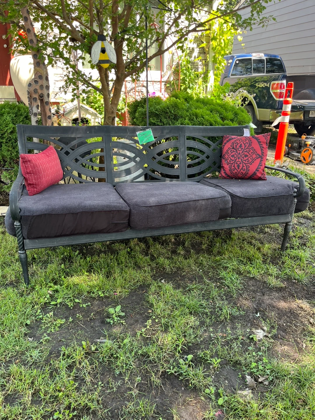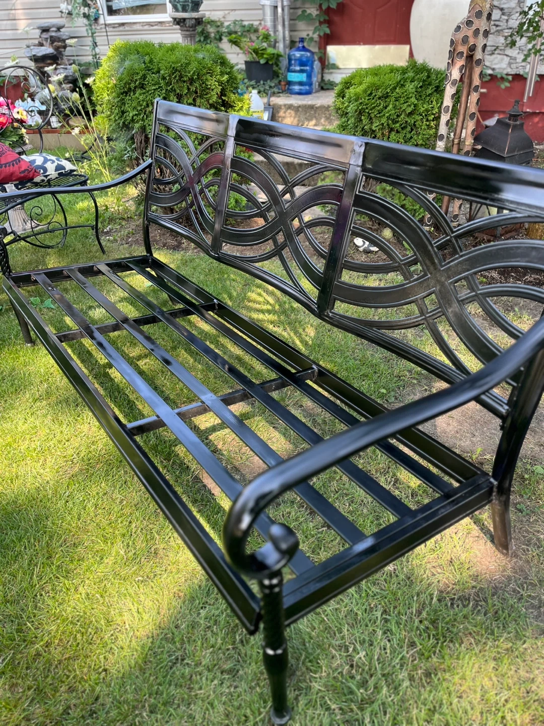 Selling a black metal garden bench. It measures approximately 6 feet in length. Perfect for adding a touch of elegance to your outdoor space!,$99 with cushions included