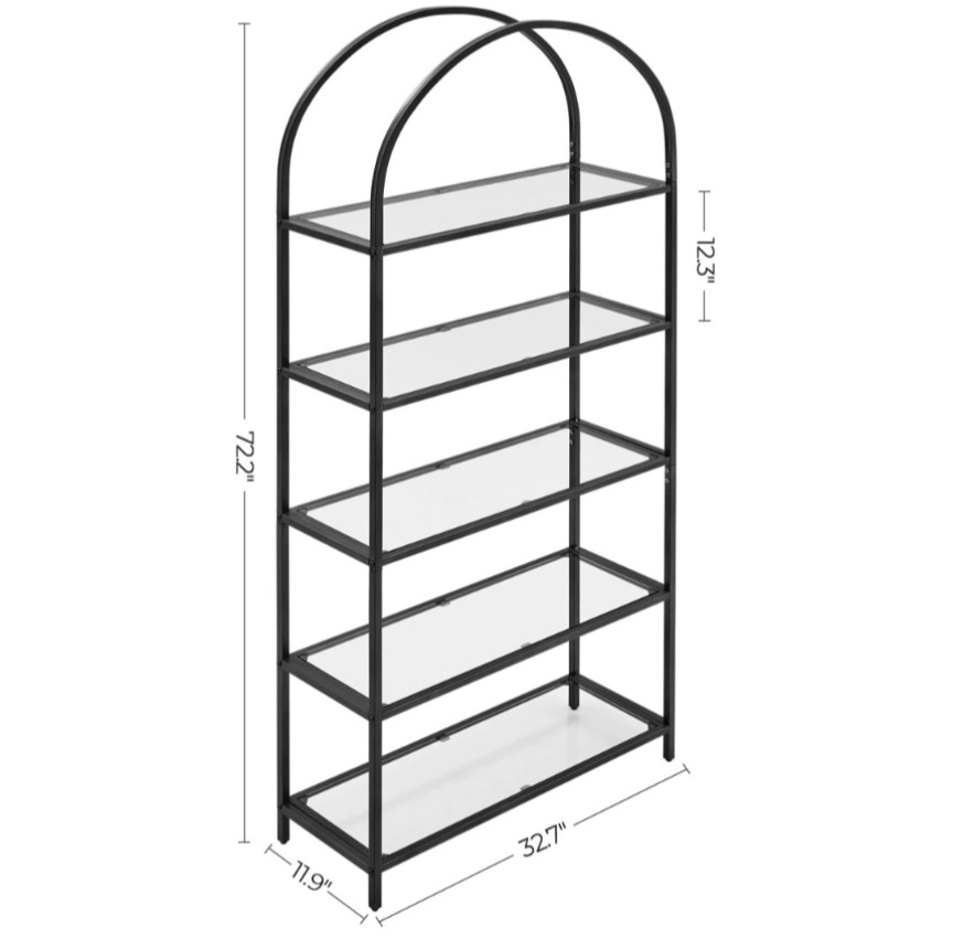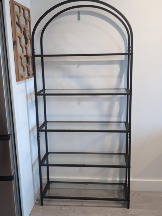 This arched bookshelf features a sleek black metal frame and clear glass shelves. It's in great condition and ready to add a touch of elegance to your space! The dimensions are approximately 72.2" tall, 32.7" wide, and 11.9" deep, with each shelf being about 12.3" apart.