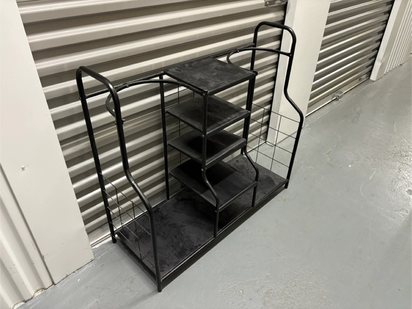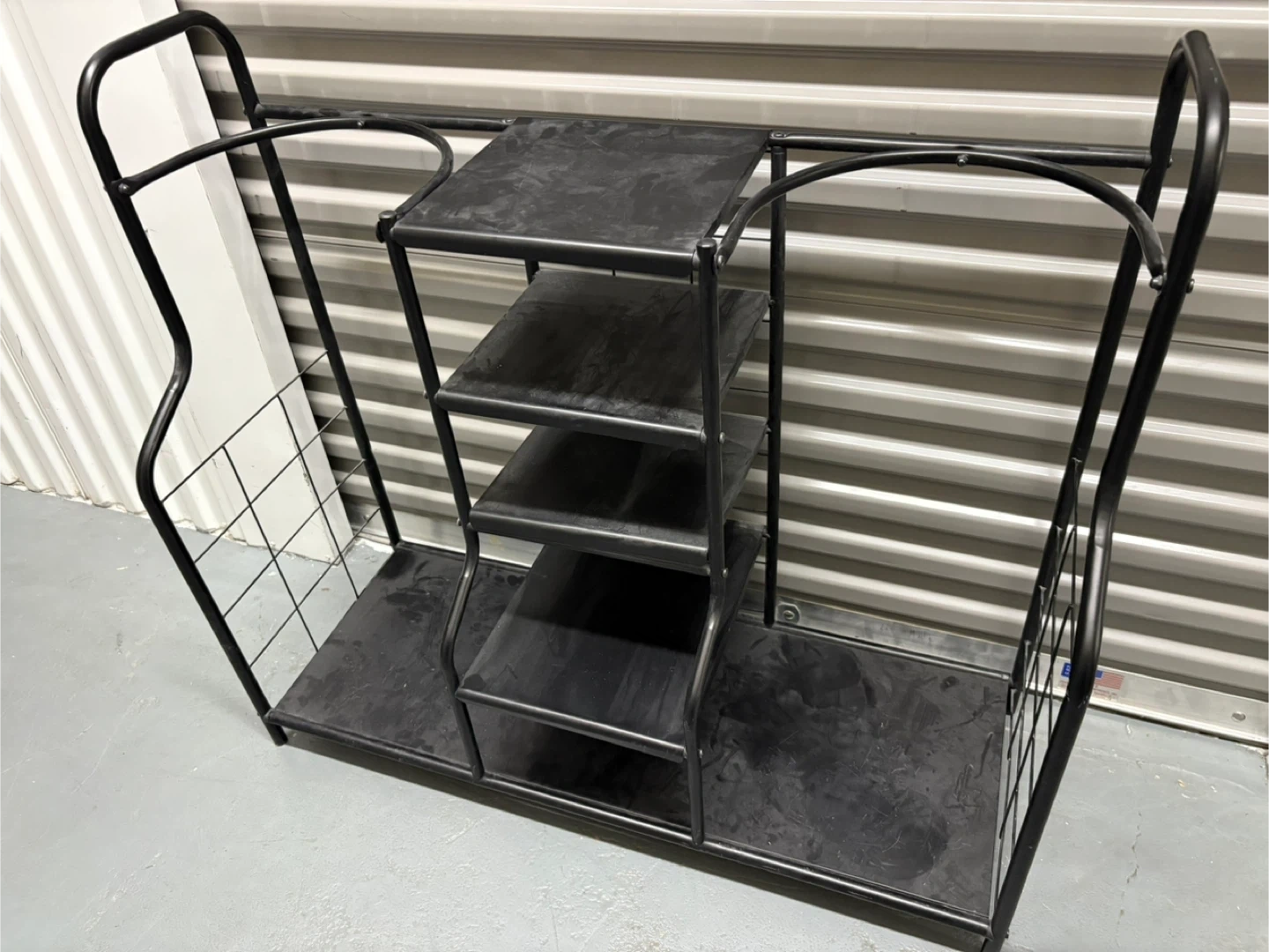 5Here's a black metal golf bag storage rack, perfect for keeping your golf gear organized. It has multiple shelves and compartments for storing bags, shoes, and other accessories. It's in good condition and ready to use!