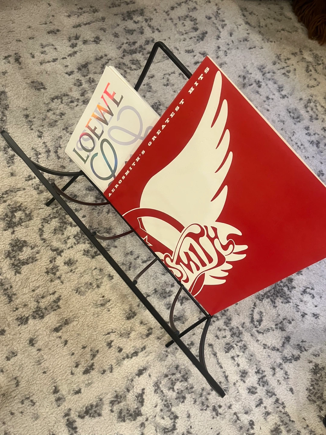 Selling a black metal magazine/vinyl record holder! It's in great condition and perfect for displaying your favorite albums. It can hold multiple records and adds a stylish touch to any room