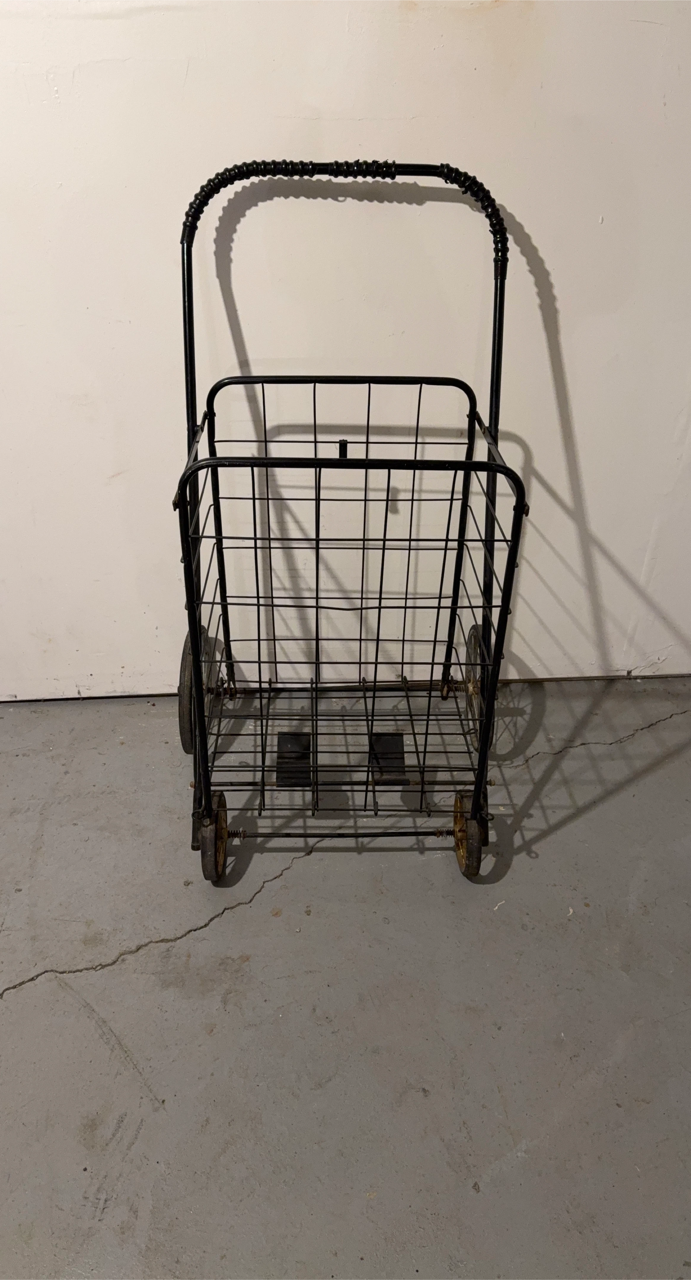 Selling a black metal shopping cart with big wheels for easy to move even in the winter . It's in used condition with some signs of wear on the wheels, but still very functional for carrying groceries or other items