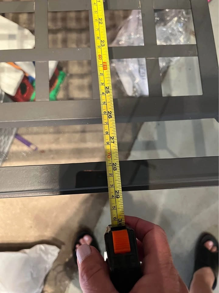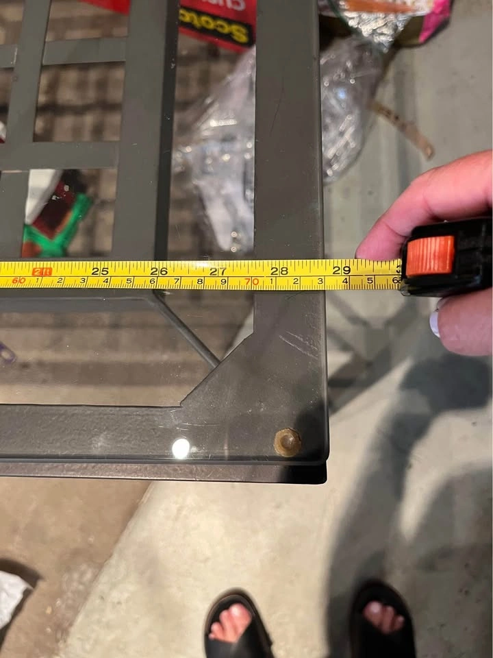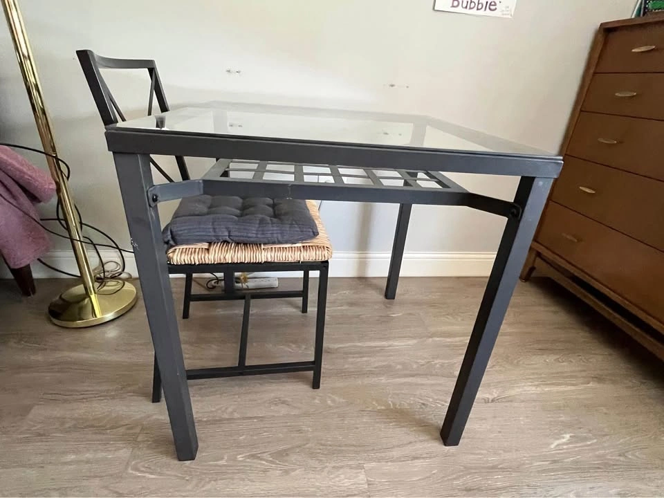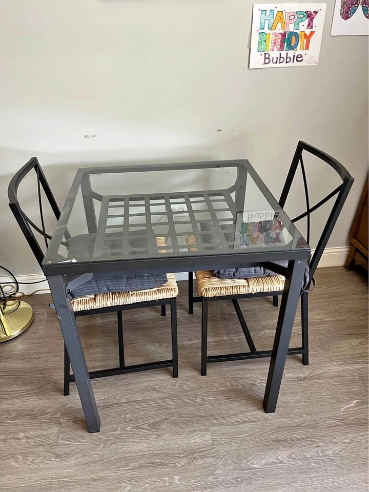 60Black metal table with glass top. Includes two chairs with detachable seat cushions. Measures 29” square and 30” high. The table and chairs are in good condition with faint markings from use. Nothing really noticeable. Will look great at your house or apt! I am able to lift the table and chairs myself. Glass table top is removable and sits on top of rubber bumpers on the table.