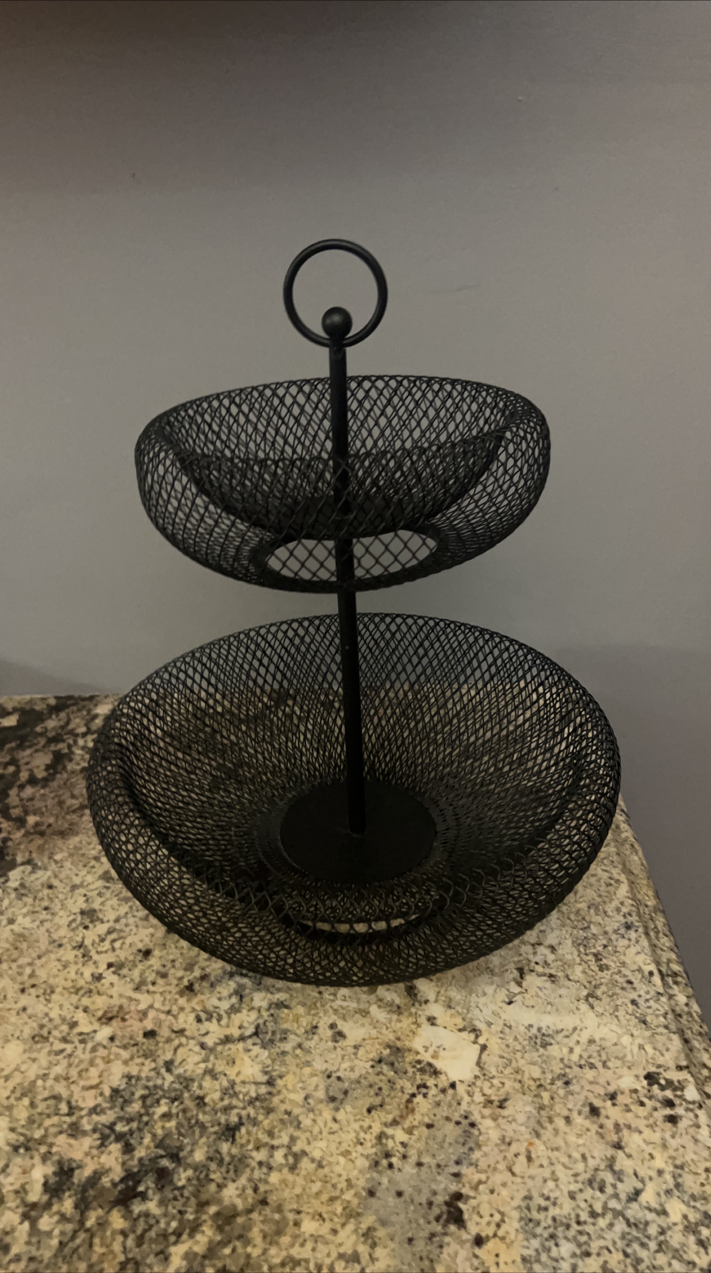 Here's a stylish black metal two-tier fruit basket! It's perfect for organizing your fruits and vegetables or even using it as a decorative piece in your kitchen or dining area. The open wire design allows for air circulation, keeping your produce fresh. It's in great condition and ready for a new home