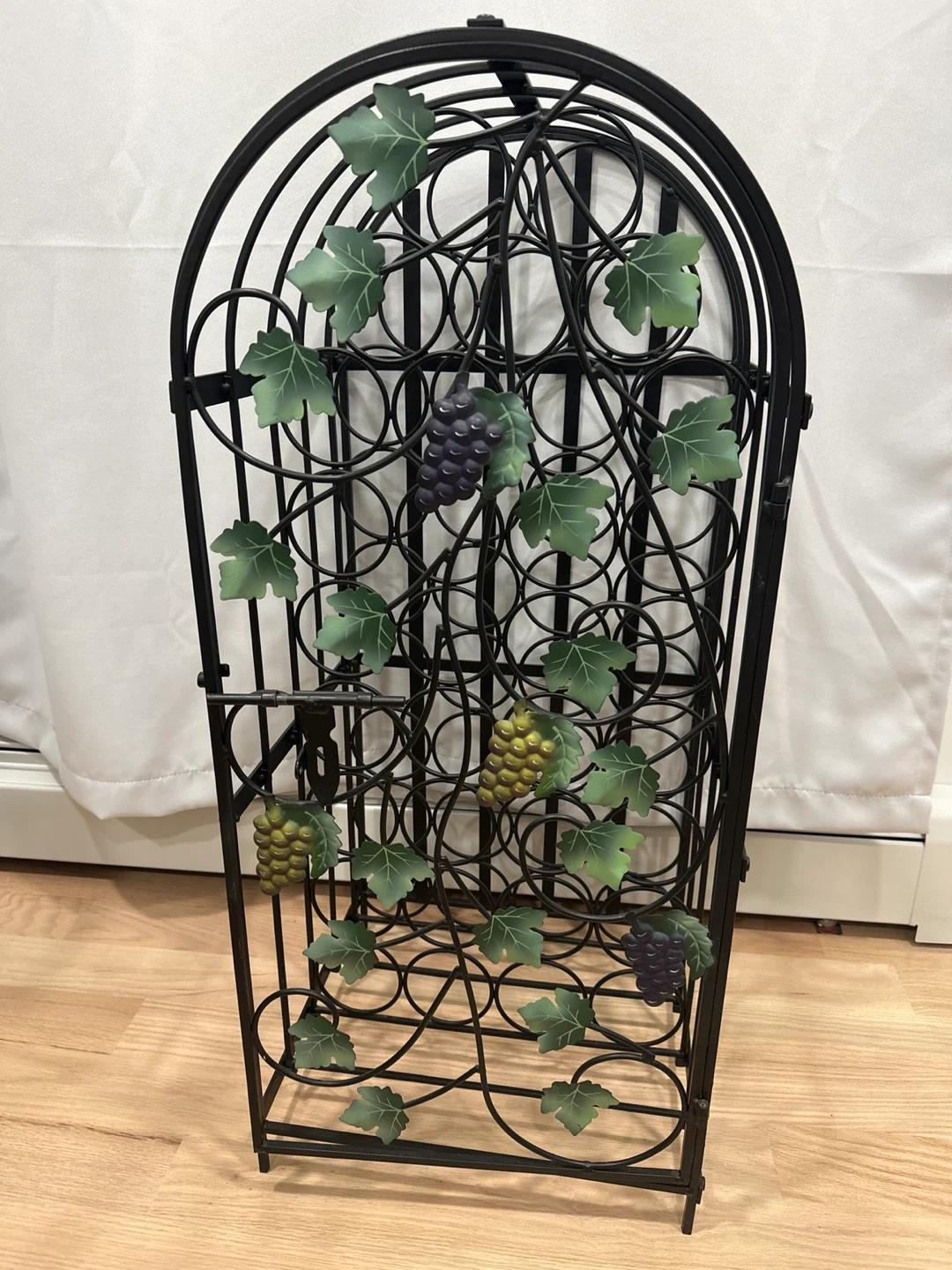 This is a sturdy black metal wine rack that can hold a good number of bottles. It has a decorative grape and leaf design on the sides. Perfect for storing your wine collection!