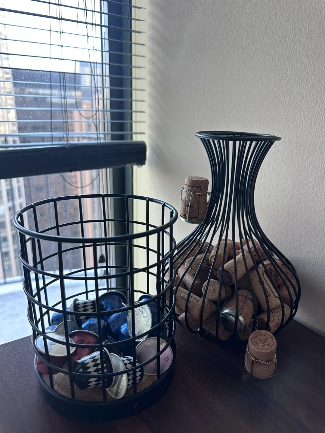 10These are two black metal wire baskets. One is a vase shape filled with corks. The other is a cylinder shape filled with coffee pods. They are in good condition and would look great in any kitchen or living room