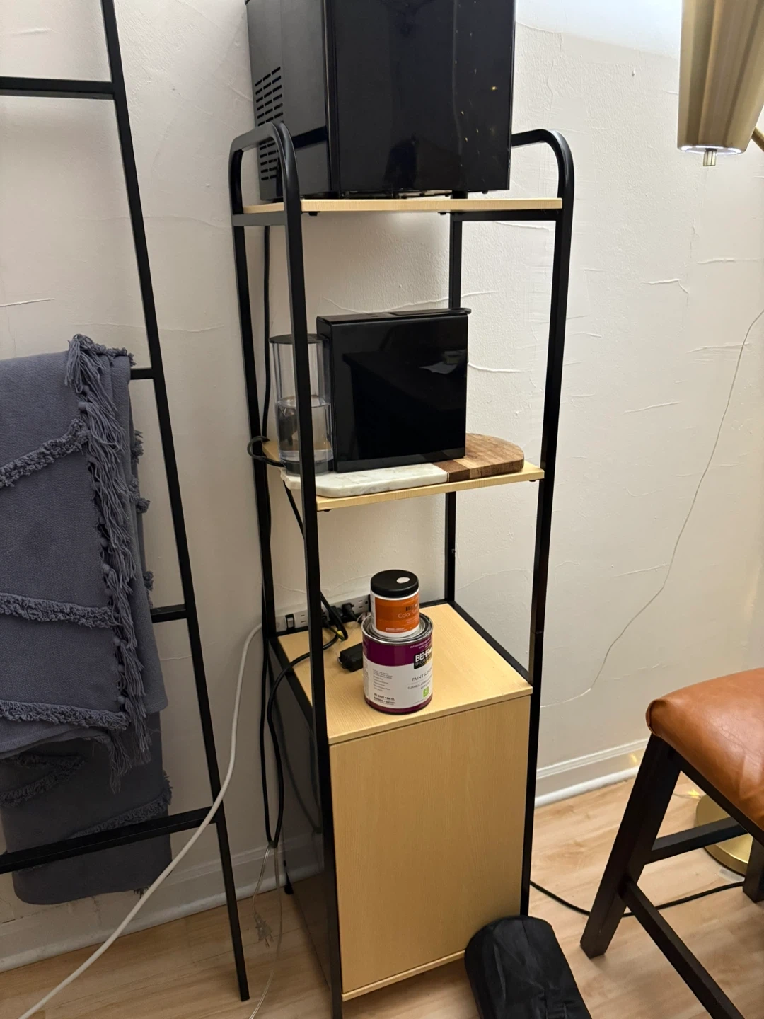 10Selling a black metal and wood storage shelf. It's in great condition and perfect for adding extra storage to any room. The shelf features multiple tiers and a cabinet with a door for concealed storage. It’s sturdy and stylish!