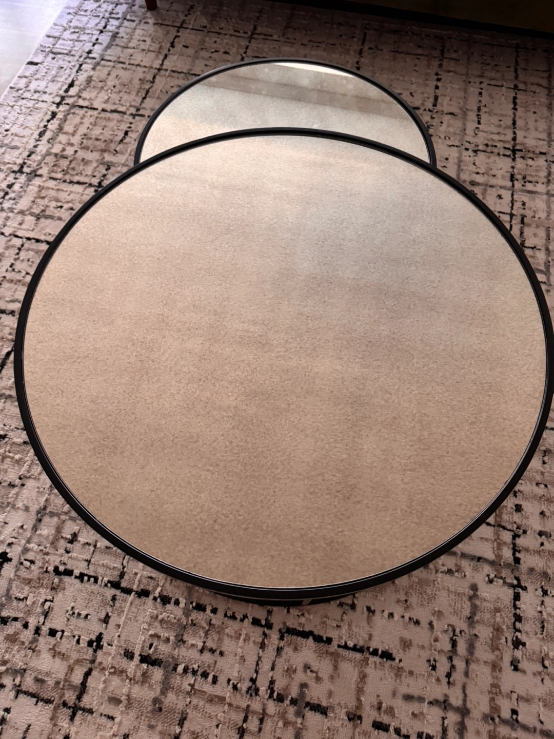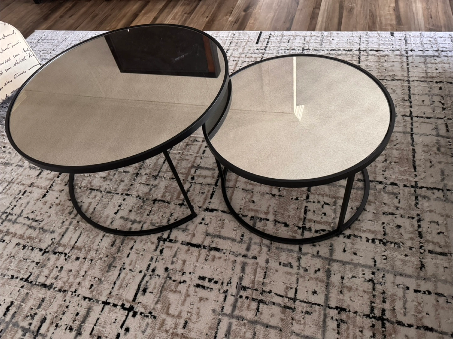 Selling a set of two nesting coffee tables! They have a sleek, modern design with black frames and mirrored tops. Perfect for adding a touch of elegance to your living room while saving space