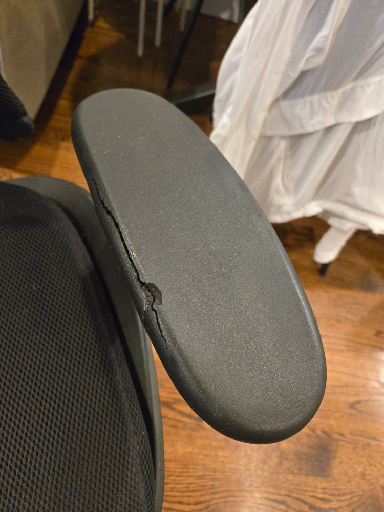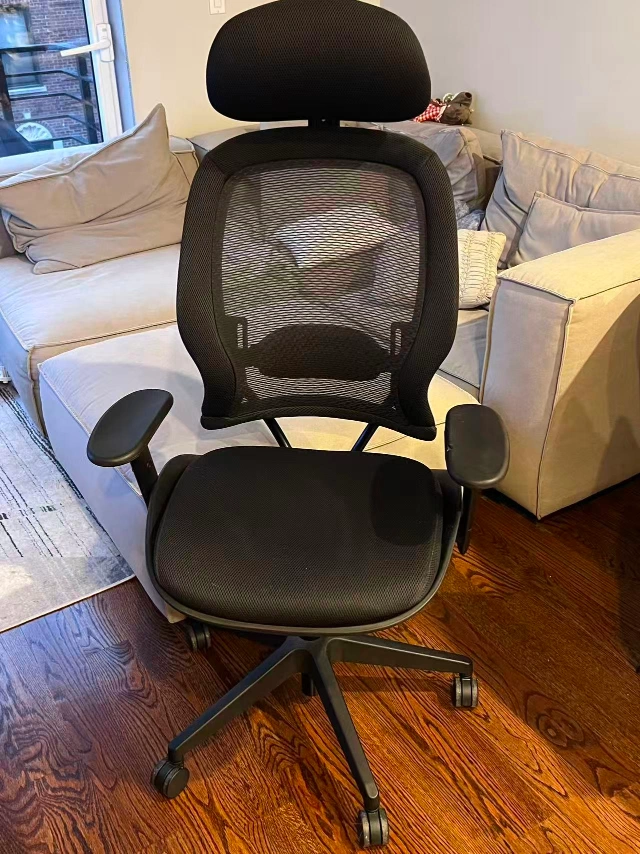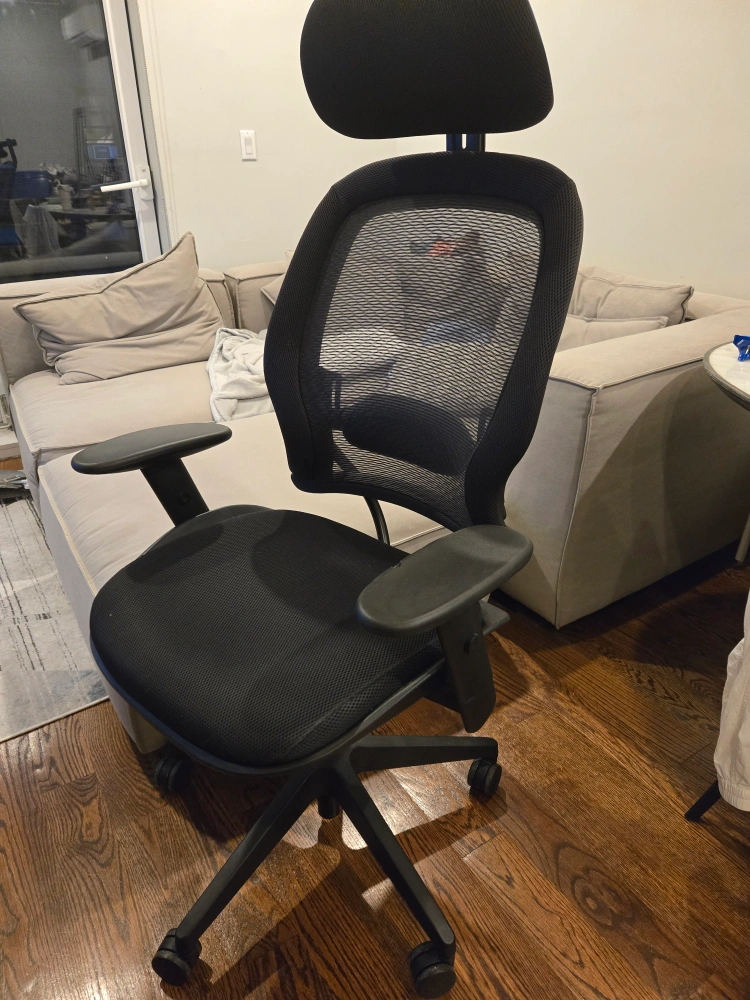 60Selling a black office chair. It's in good condition and comfortable for long work sessions. Has a mesh back and adjuatable head and back rest. Please note that there is some wear and tear on the left armrest, as shown in the pictures.