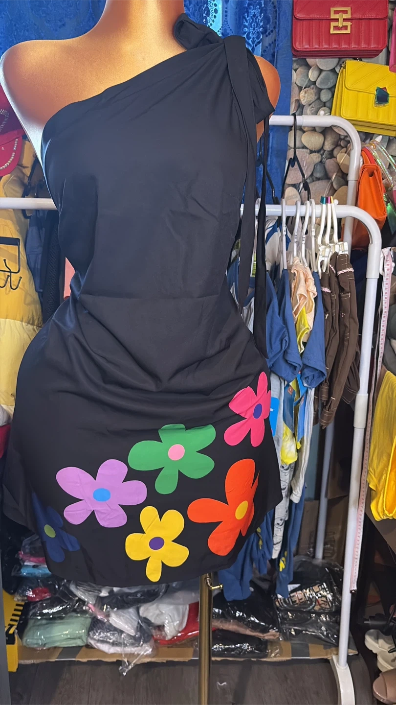 Here's a cute black one-shoulder dress! It has a fun floral design at the bottom. Perfect for a casual day out or a summer party!