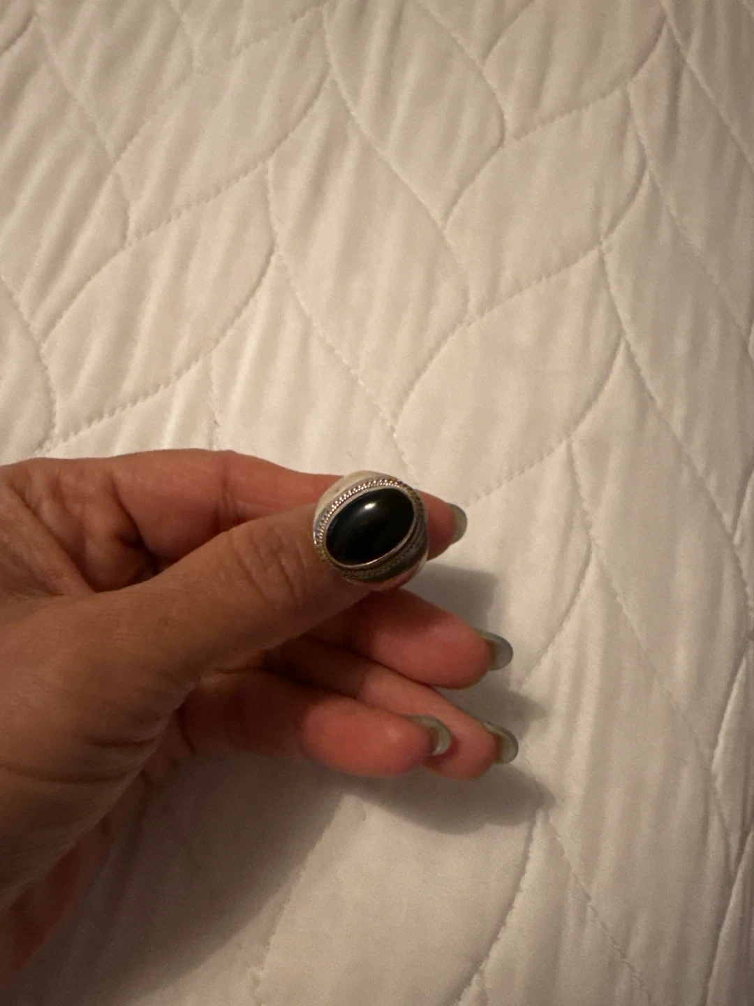 334Here's a silver ring with a black onyx stone set in a silver-tone metal. It's in good condition and ready for a new home!