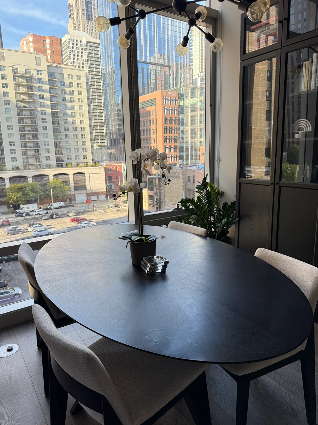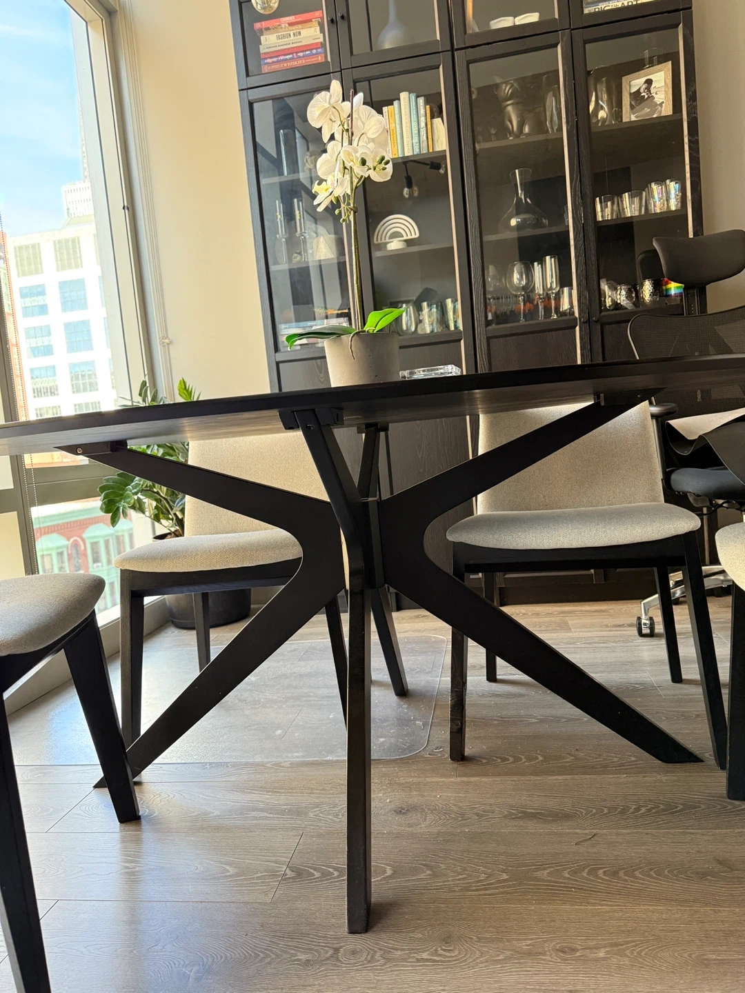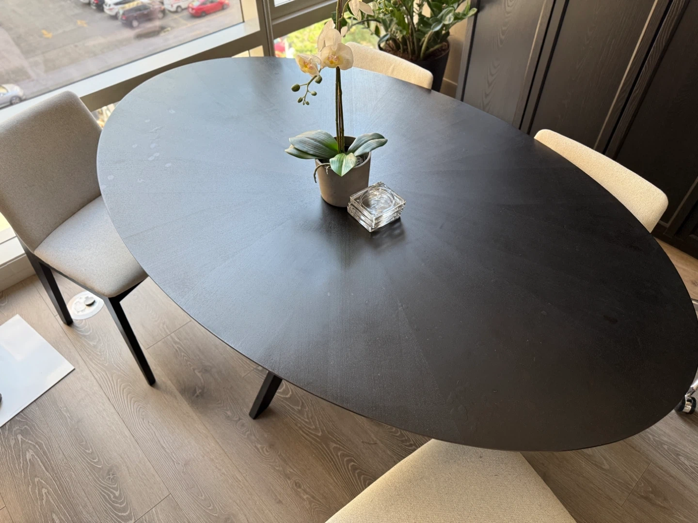 10****NO CHAIRS *****Selling a black oval dining table ONLY! It has a unique leg design and seats up to six people comfortably. There are some minor signs of wear on the surface, but overall it's in good condition and ready for a new home Original price: $800 AllModern https://offerup.com/redirect/?o=aHR0cHM6Ly93d3cuYWxsbW9kZXJuLmNvbS9mdXJuaXR1cmUvcGRwL2ZlbndheS03MDUtcGVkZXN0YWwtZGluaW5nLXRhYmxlLWEwMDA5MzkyNDcuaHRtbD9waWlkPTM5MTgyMDM5 Fenway 70.5'' Oval Dining Table A starburst design + boomerang legs launch this pedestal dining table to statement-making territory. It's made from kiln-dried wood and delivers a dynamic silhouette inspired by space-age mid-century style. The oval table top seats up to six for casual meals and special occasions. Choose from a selection of finishes for the ideal look in your dining room. Features • A dynamic starburst pattern on the table top • An eye-catching silhouette with boomerang-style legs. • Sized to accommodate six people Dimensions + Details Other Dimensions Overall 29.5" H X 70.5" W X 43.5" D Overall Product Weight 73 lb. Minimal chips in paint and a few bubbles from heat/water. See detailed pictures Pick up ONLY. MUST disassemble and carry yourself. Please bring a truck or large SUV for one trip.