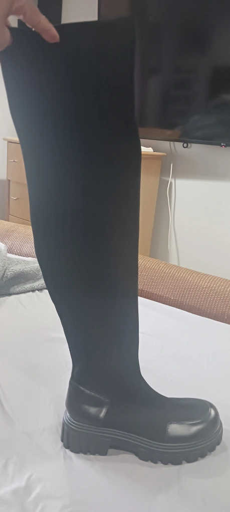 Selling a pair of black over-the-knee boots with a chunky platform sole. They're in great condition and would be a stylish addition to your wardrobe!