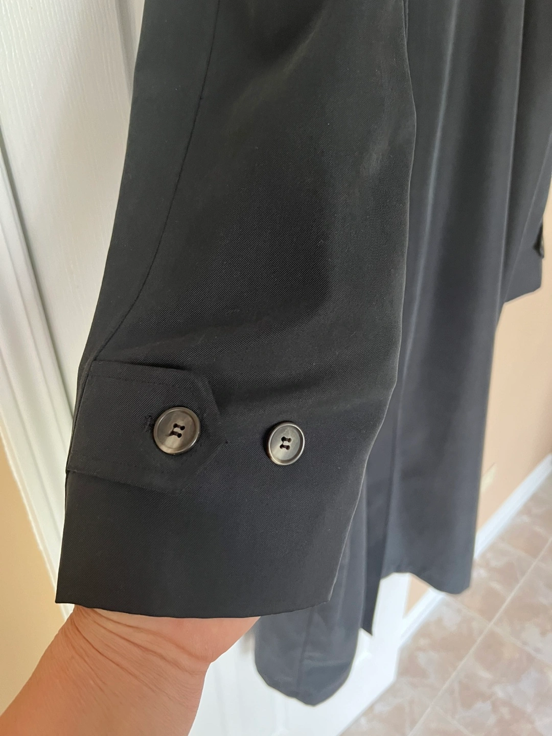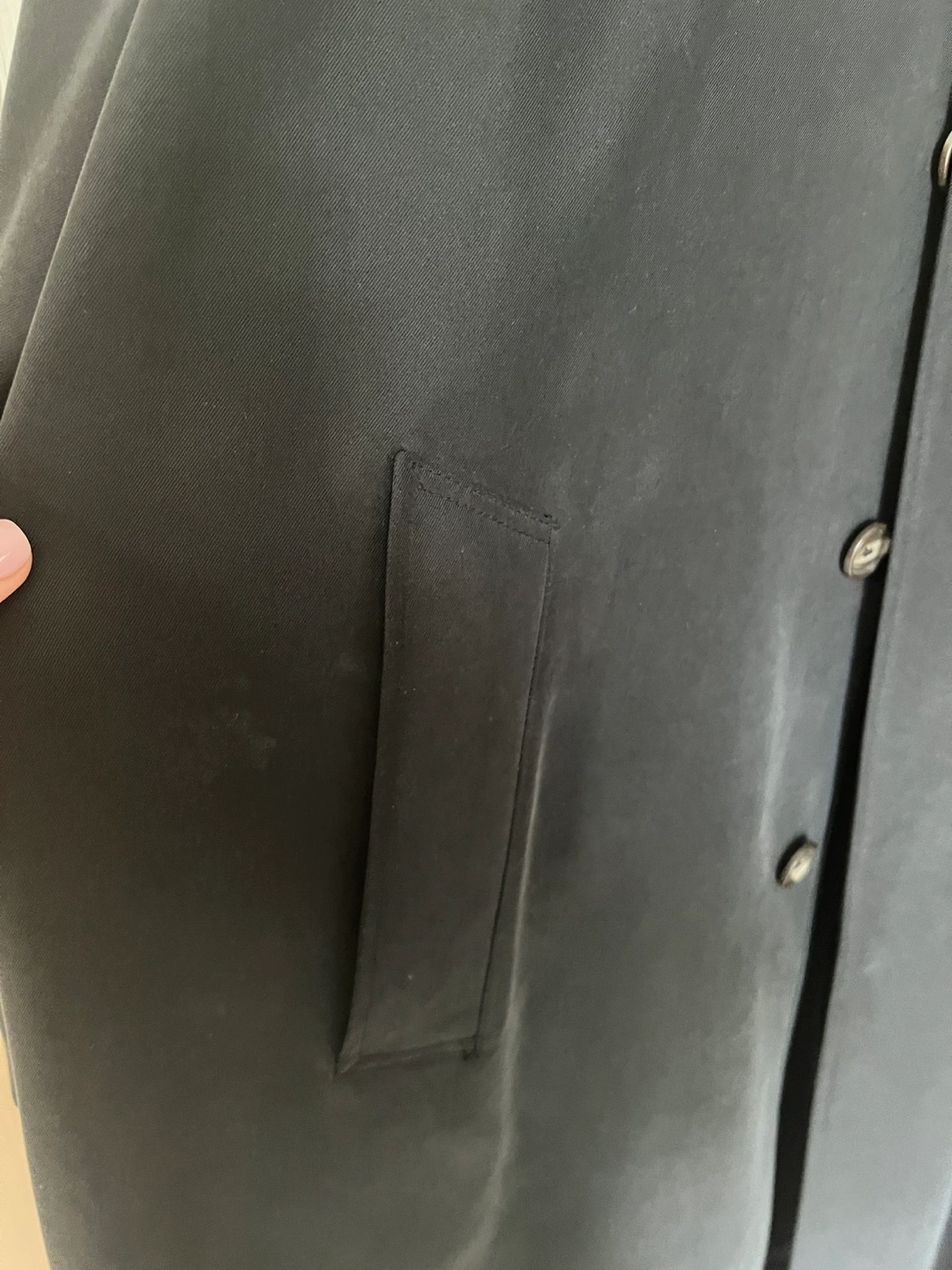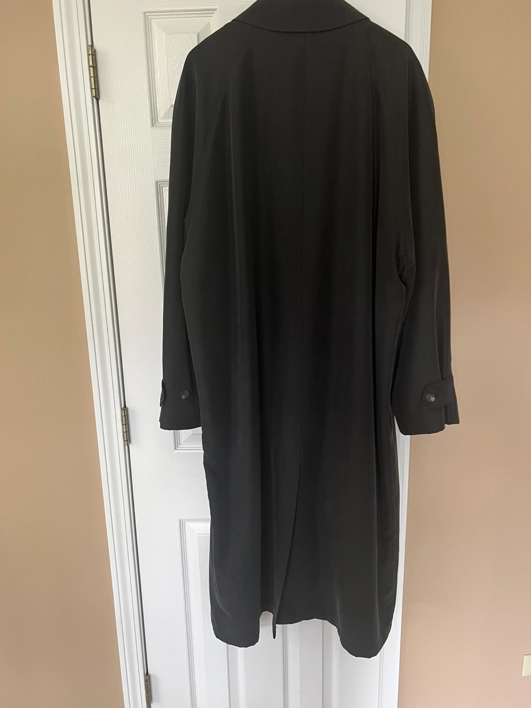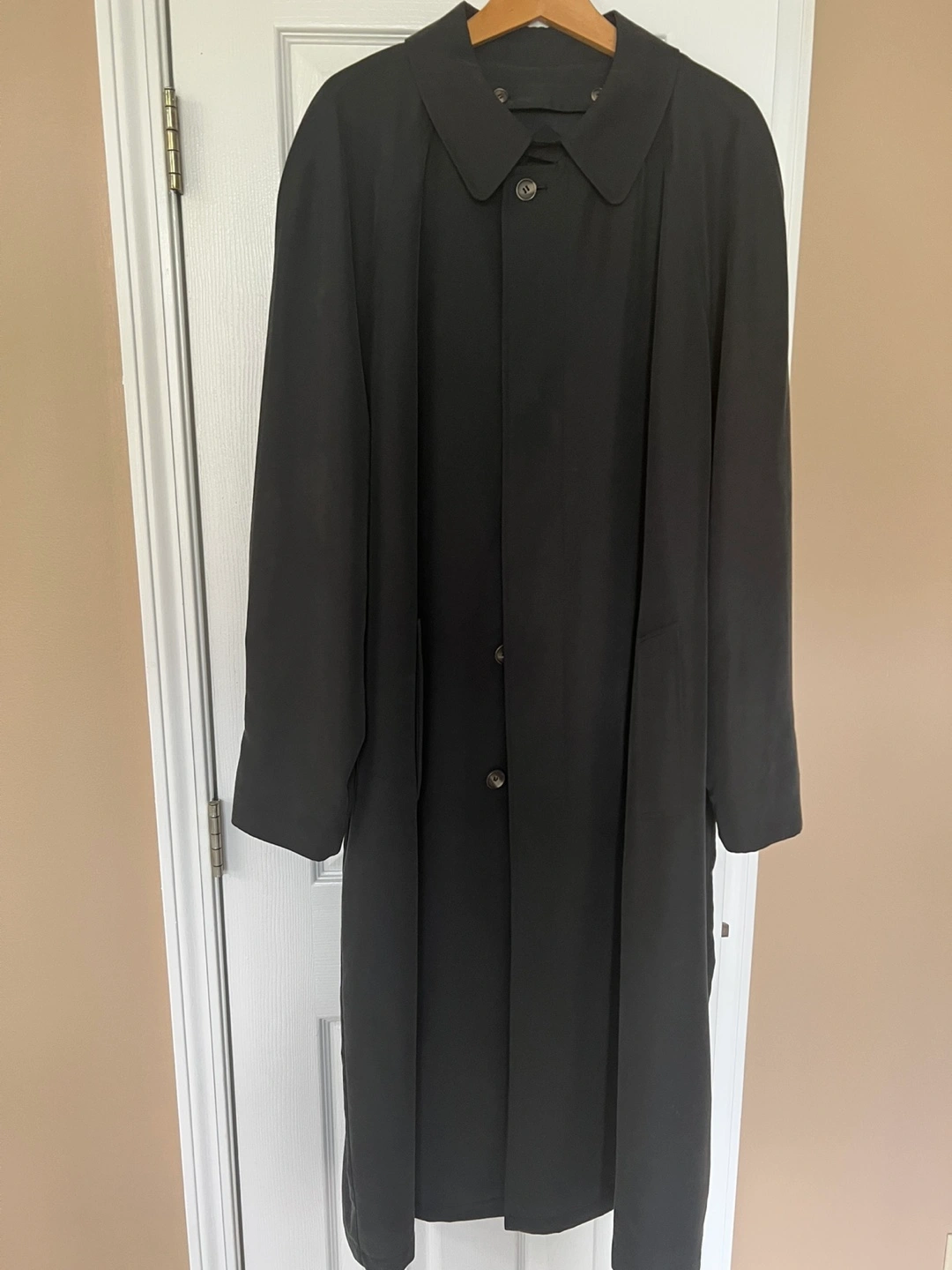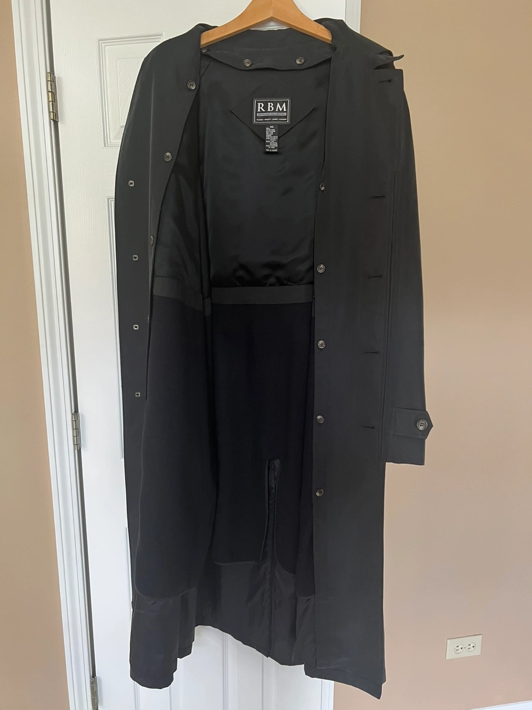 Selling a black overcoat. It's in good condition and ready for a new home. Removable insulation, all buttons attached, has two sides packets. After cleaning. Sleeves 29in, pit to pit 28in, 51 inches long. Fabric description on pictures.