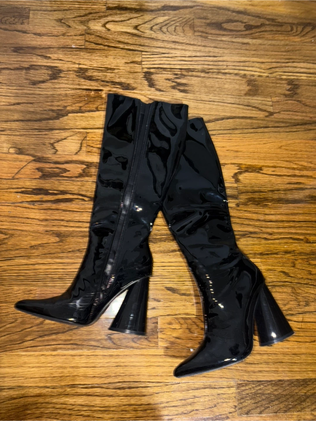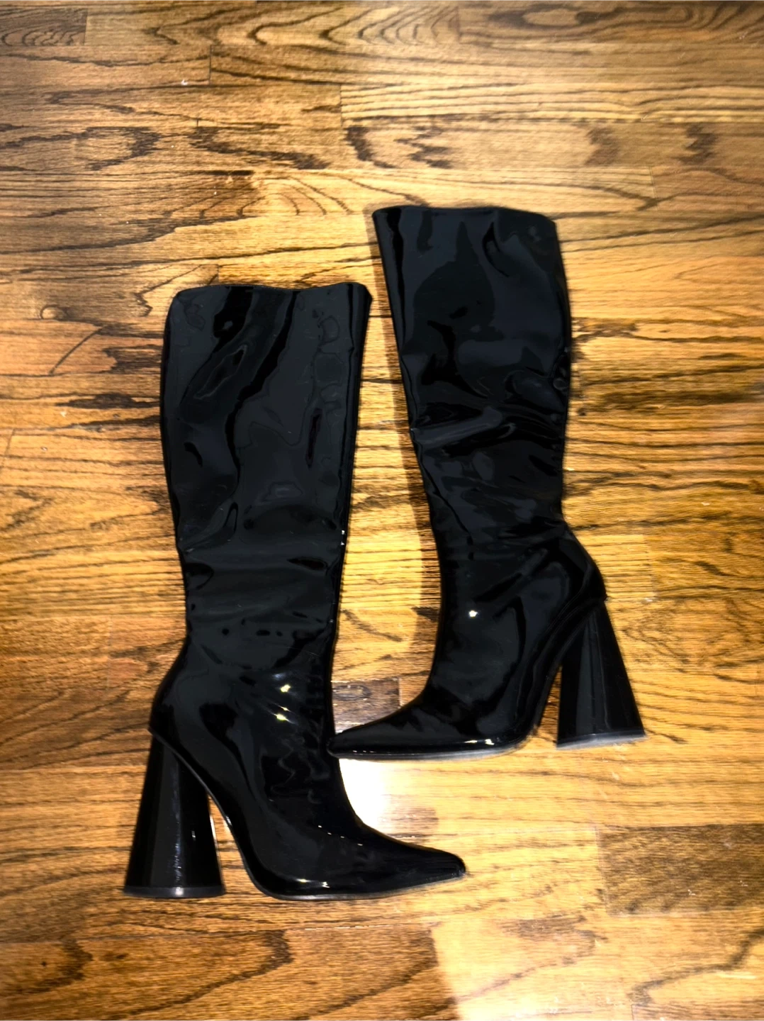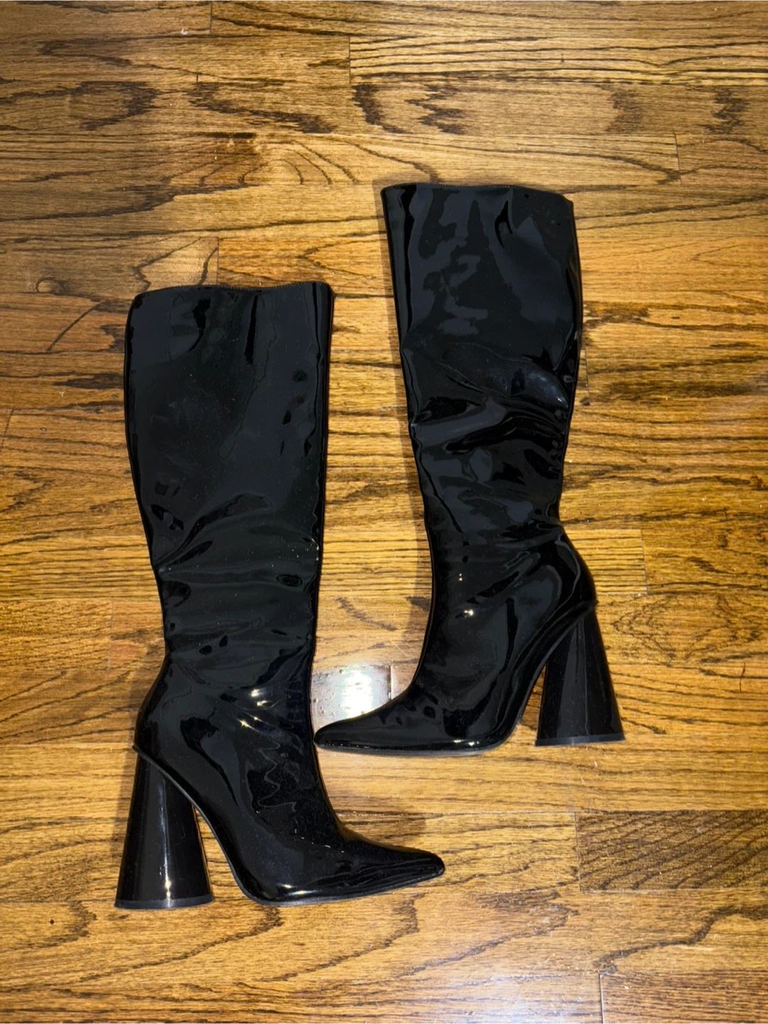 73Selling a pair of black patent leather knee-high boots. They have a pointed toe and a chunky heel. These boots are in great condition and would be a stylish addition to any wardrobe!