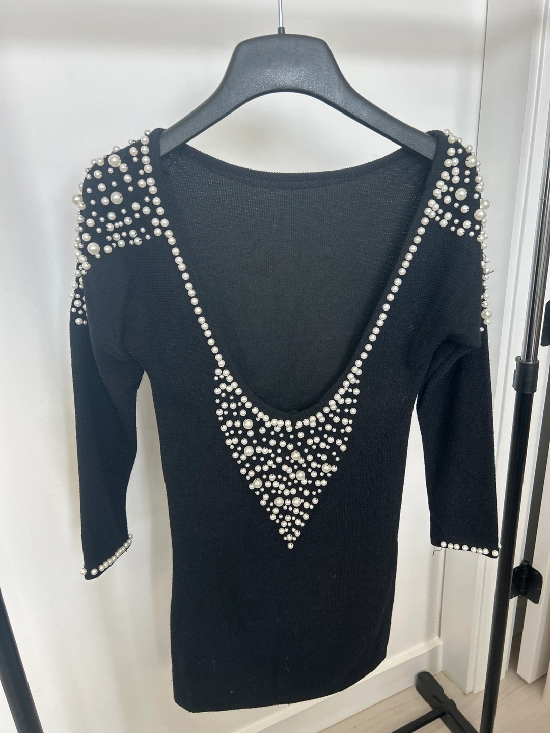 65This is a stylish black mini dress with pearl embellishments around the neckline and shoulders. It's a unique piece that's sure to make a statement