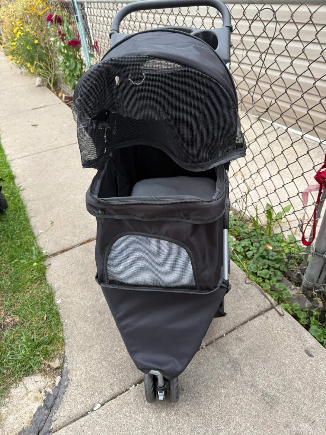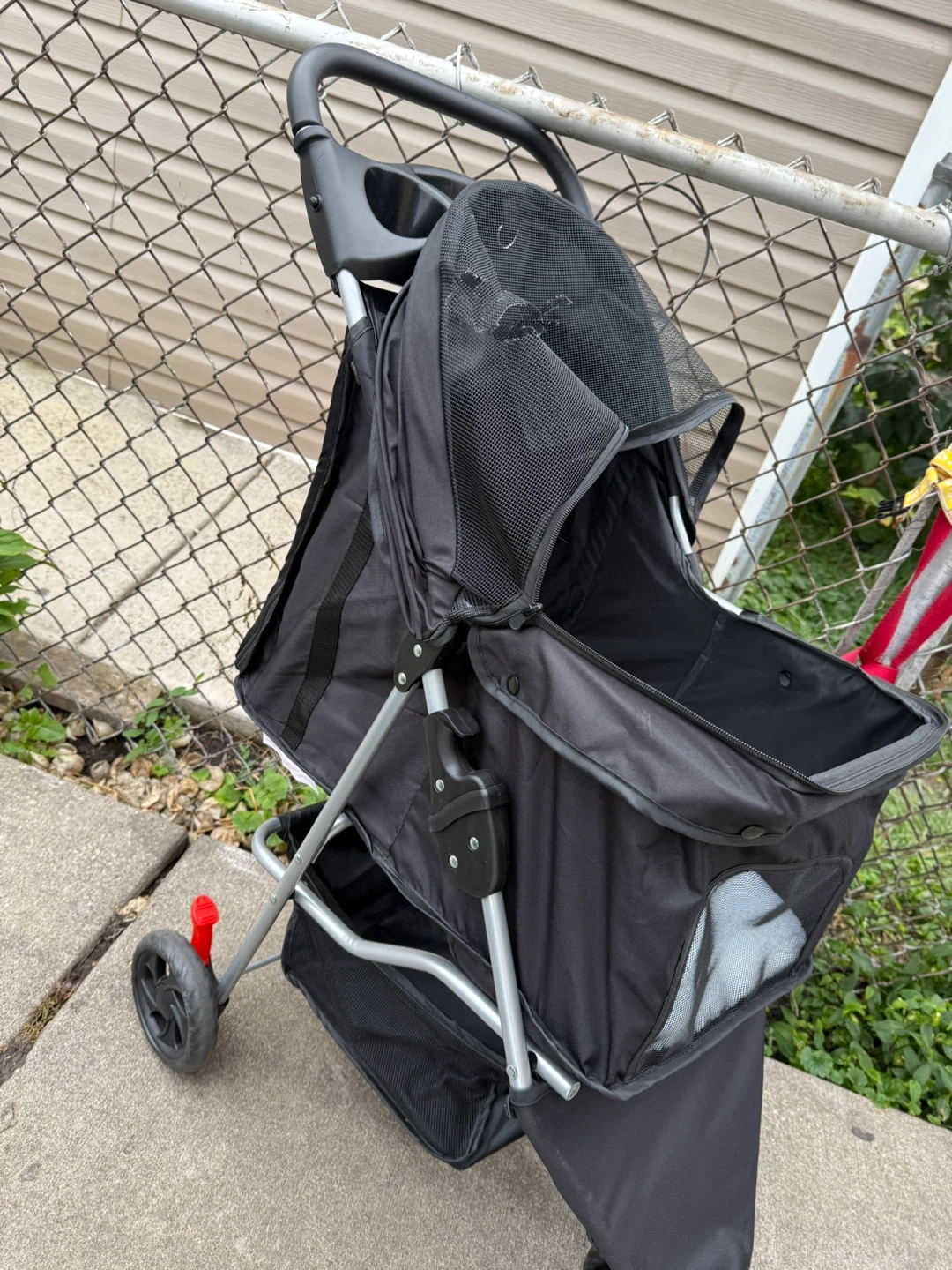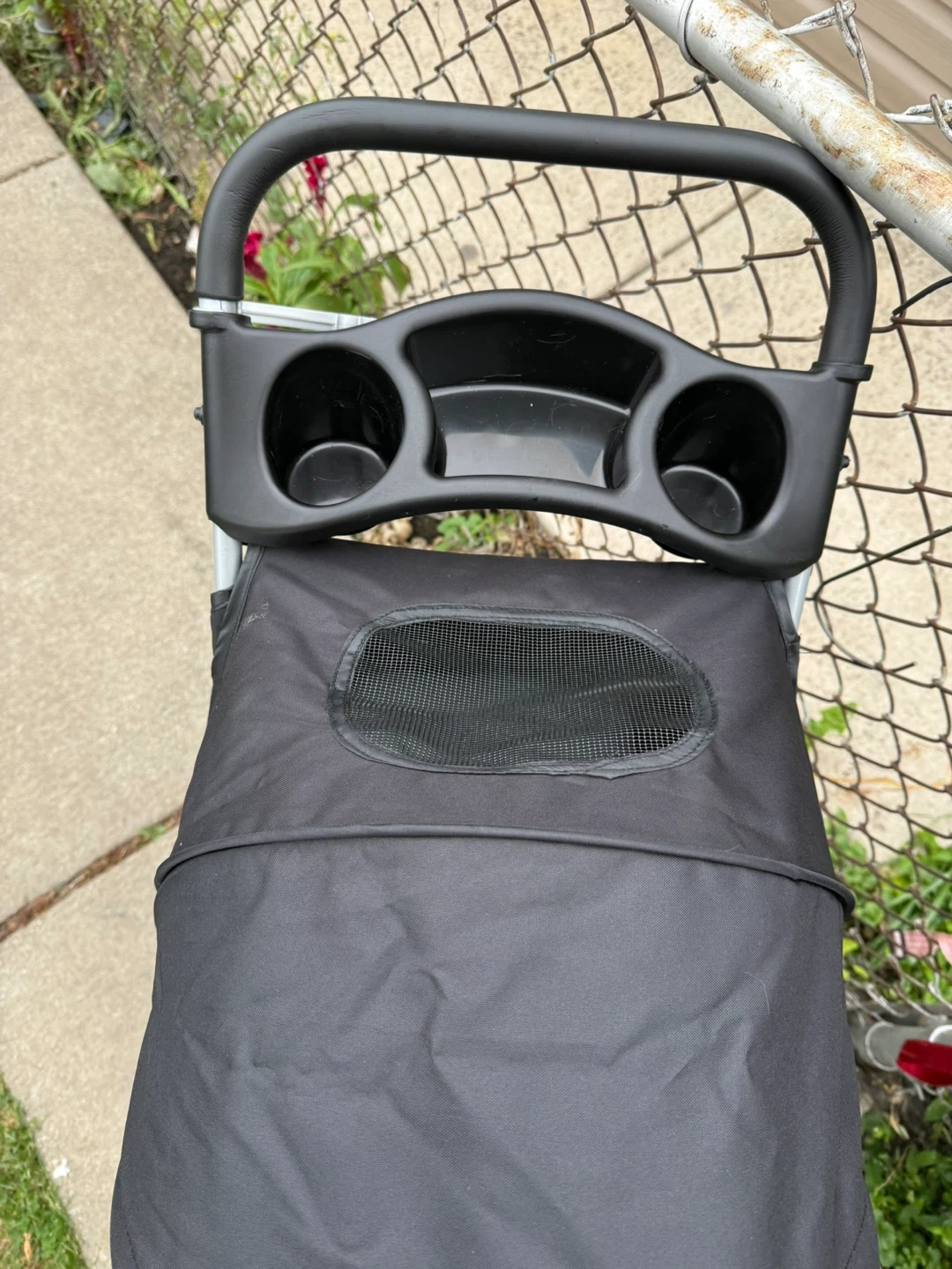 Selling a black pet stroller! It's in good condition and ready for your furry friend. It has a mesh window and a convenient cup holder for you
