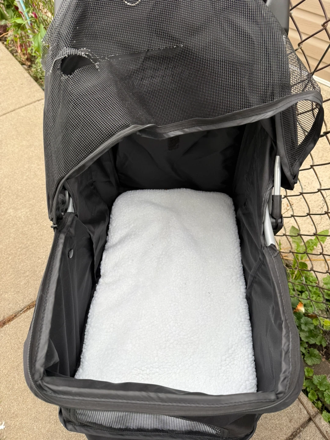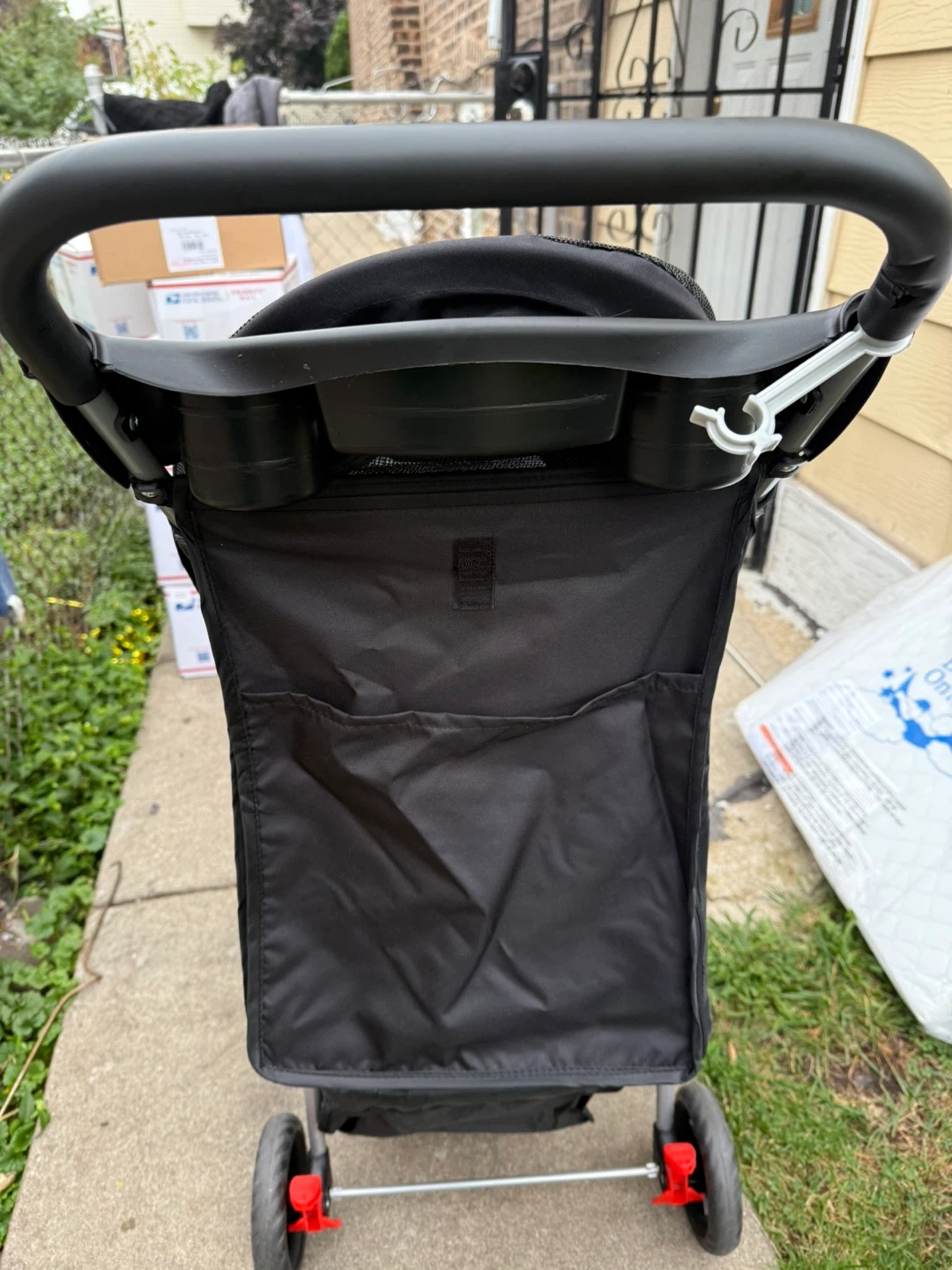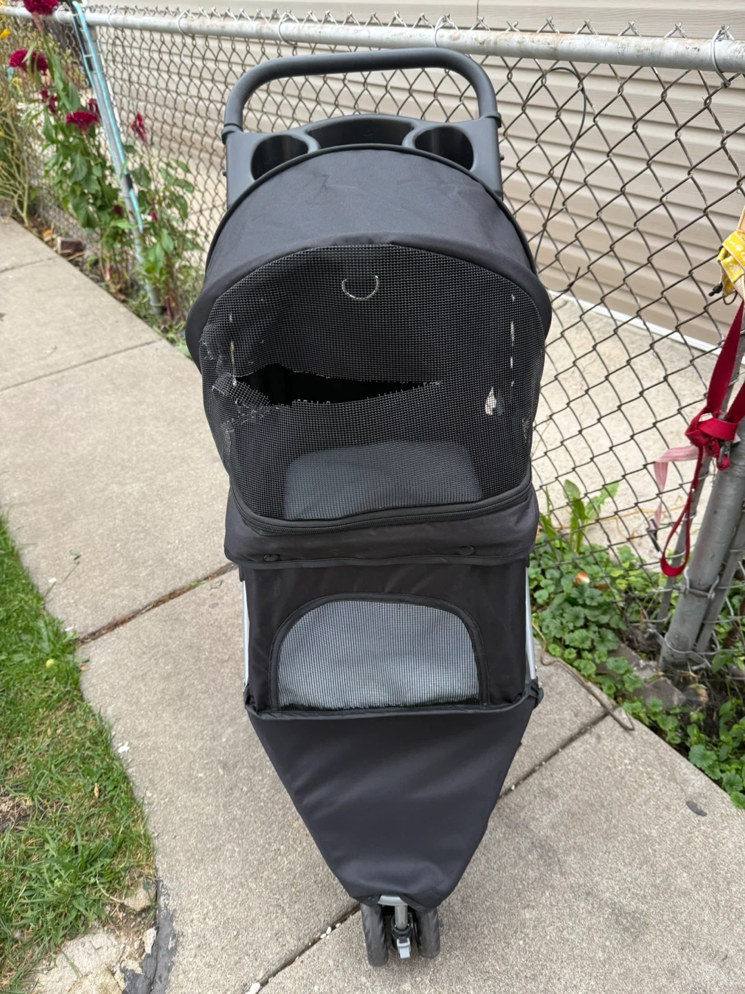 Selling a black pet stroller! It's in good condition and ready for your furry friend. It has a mesh window and a convenient cup holder for you